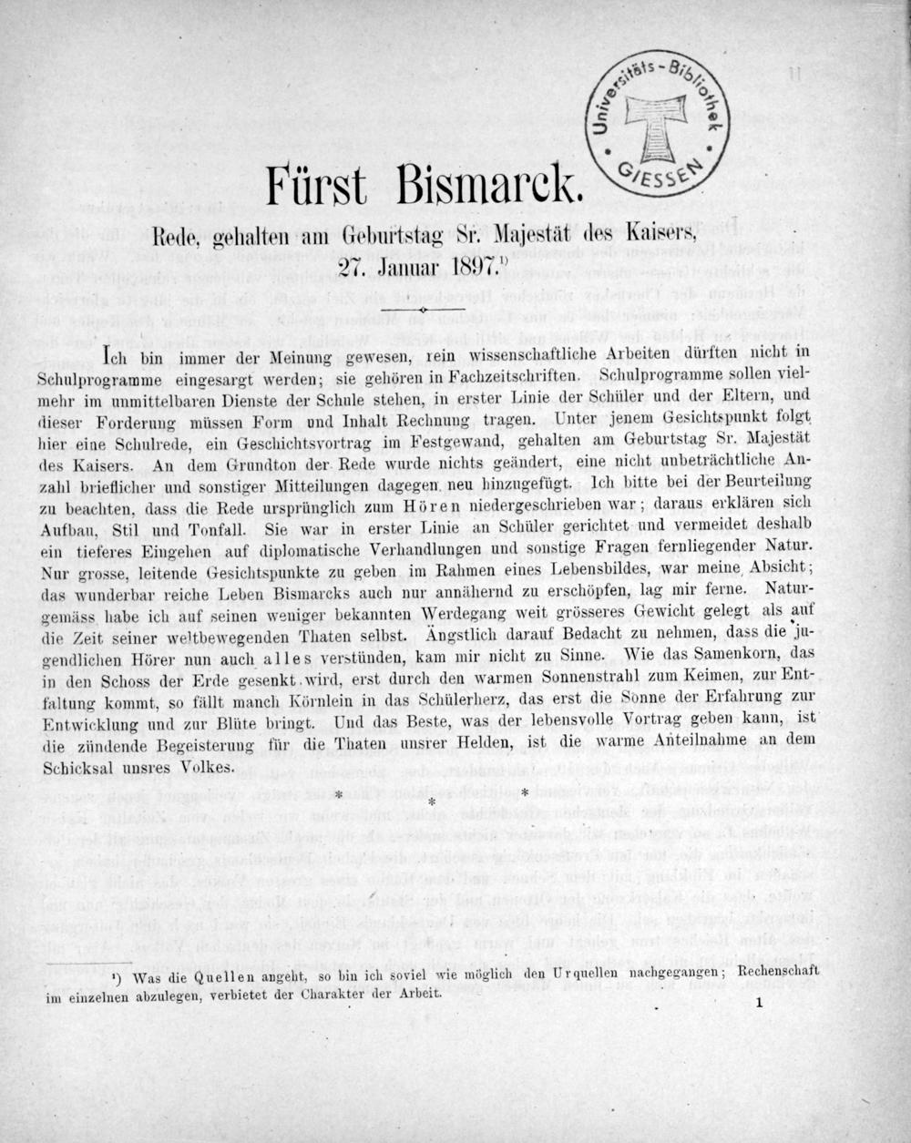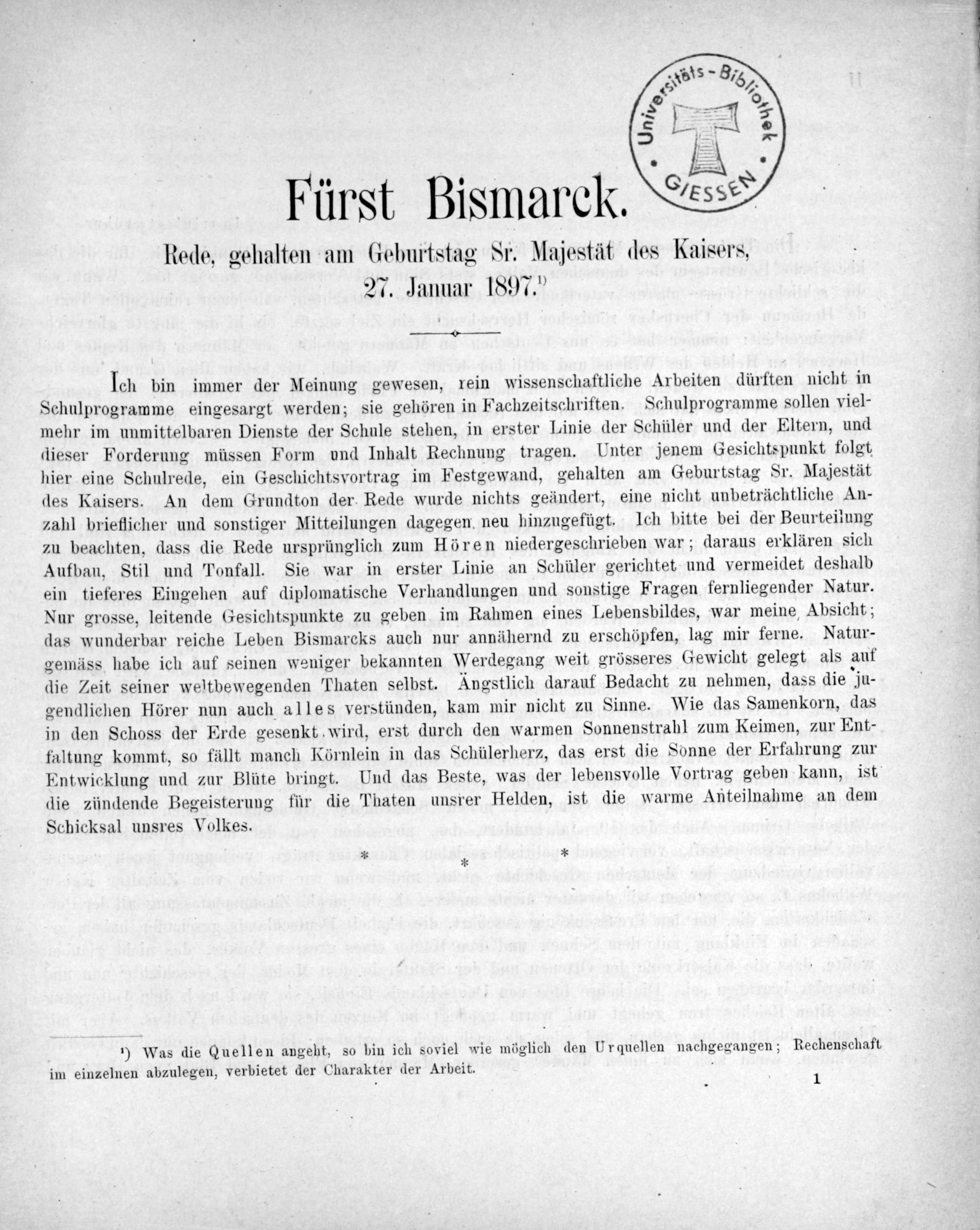 Fürst Bismarck : Rede, gehalten am Geburtstage Sr. Majestät des Kaisers, 27. Januar 1897 / von Otto Ankel
