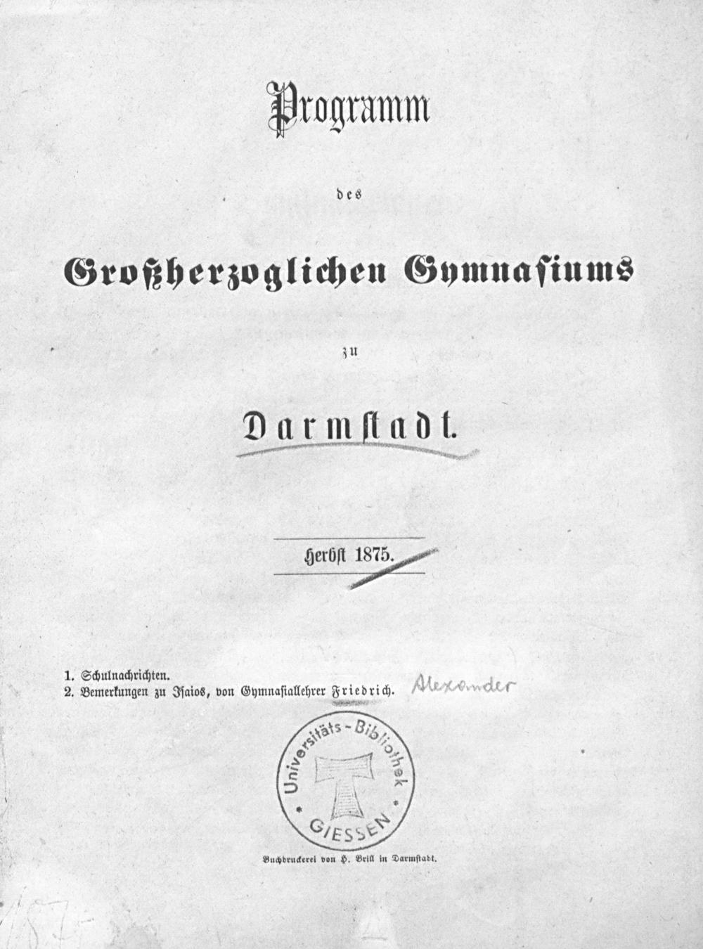 Programm des Großherzoglichen Gymnasiums zu Darmstadt