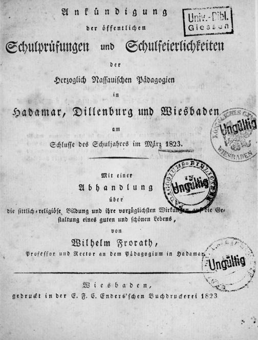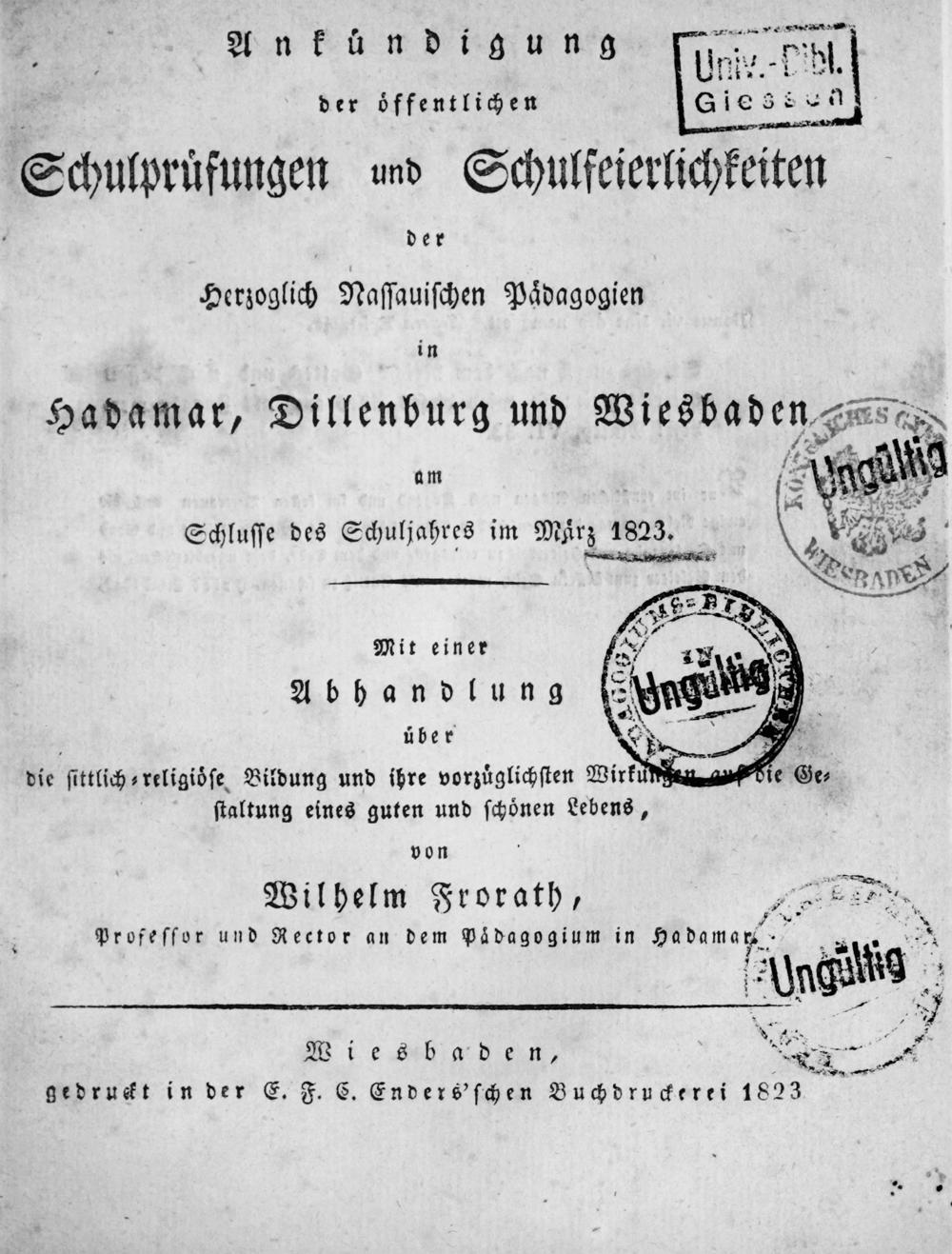 Ankündigung der öffentlichen Schulprüfung des Herzoglich-Nassauischen Pädagogiums zu Wiesbaden