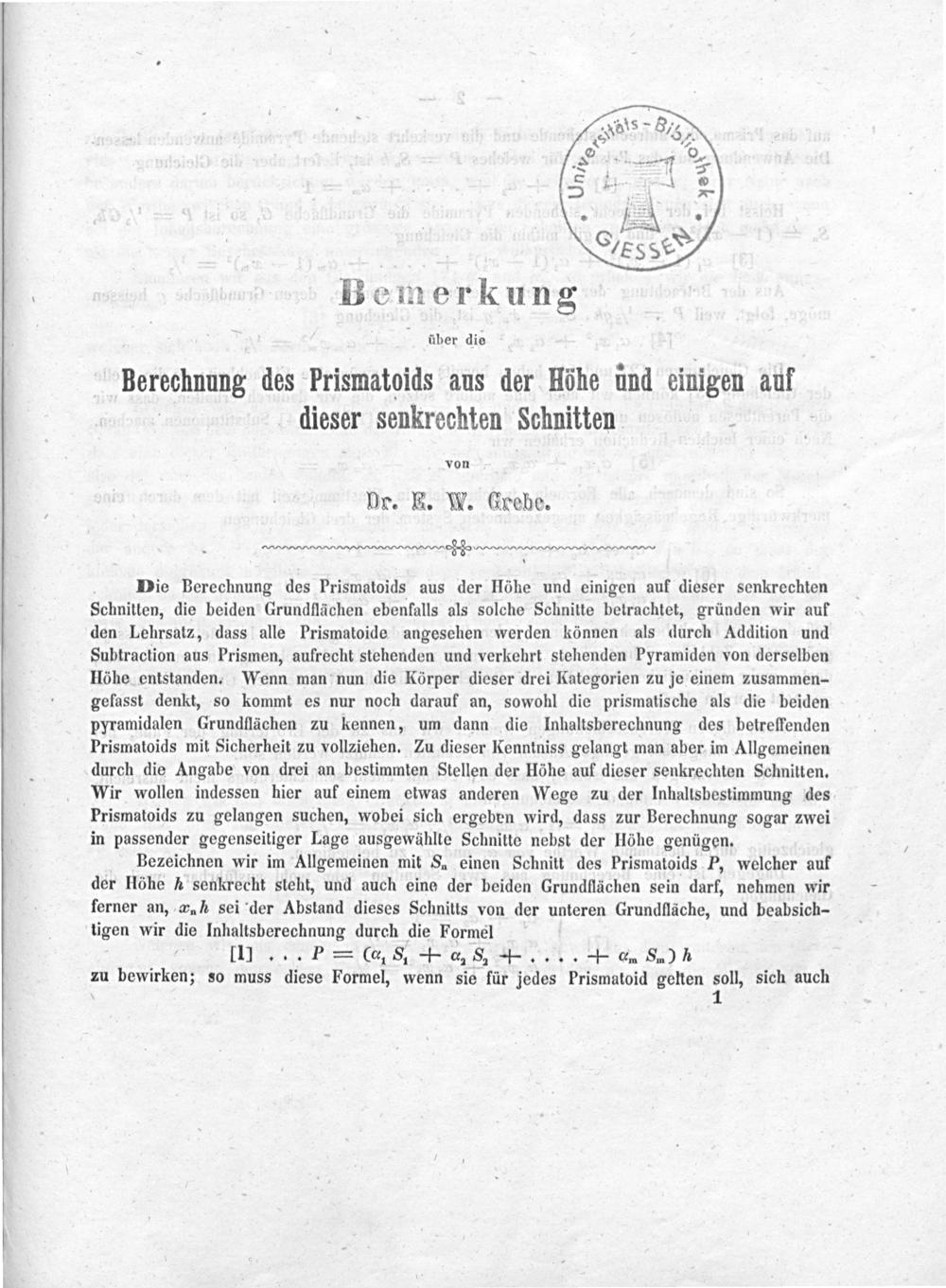 Bemerkungen über die Berechnung des Prismatoids aus der Höhe und einigen auf dieser senkrechten Schnitten / von E. W. Grebe
