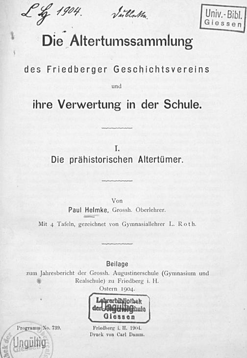Die Altertumssammlung des Friedberger Geschichtsvereins und ihre Verwertung in der Schule : 1. Teil. Die prähistorischen Altertümer / von Paul Helmke