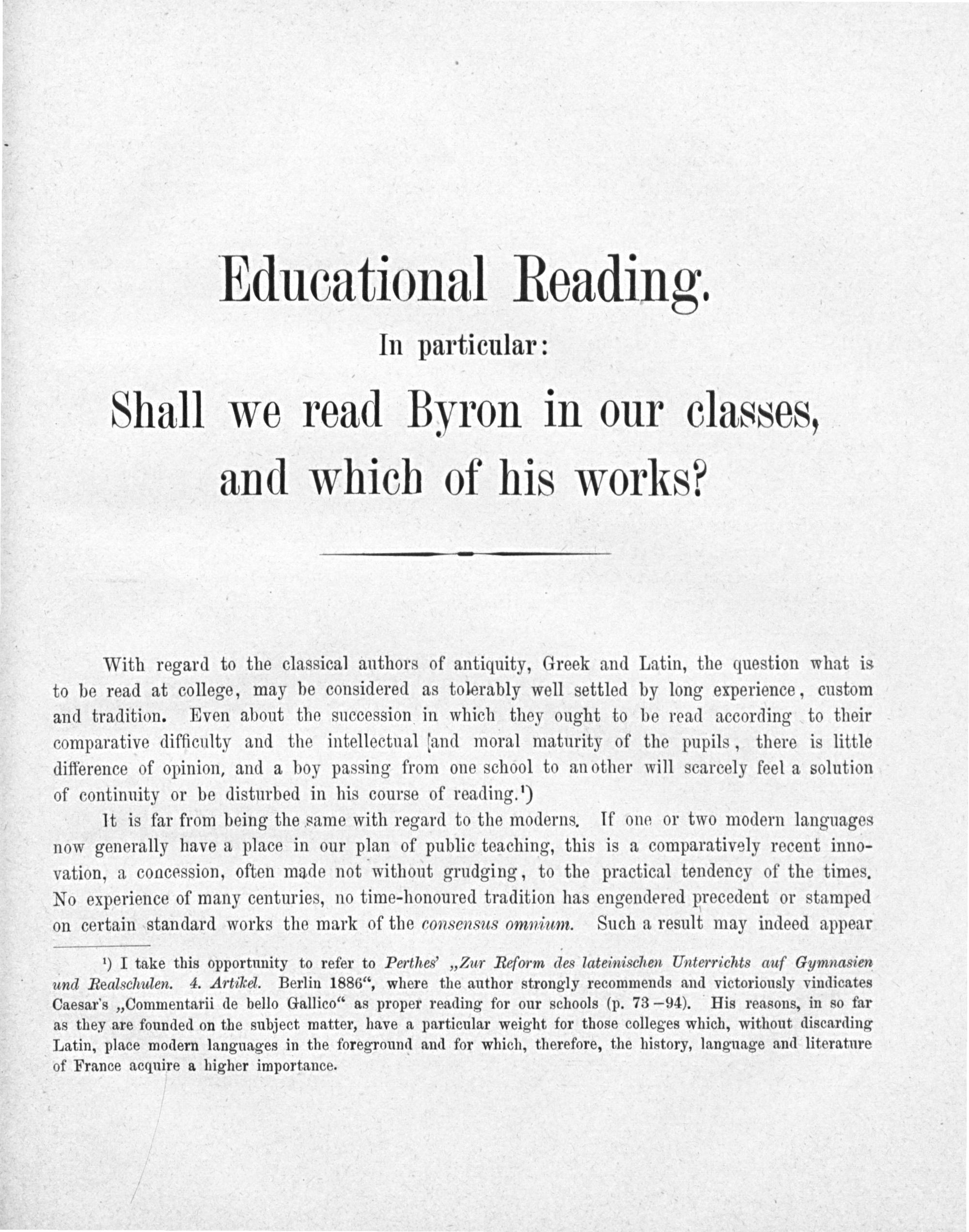 Educational Reading : In particular: Shall we read Byron in our classes, and which of his works?