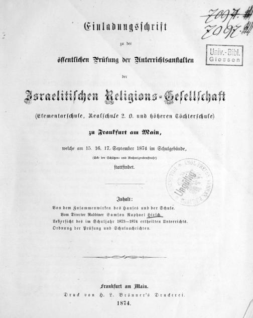 Einladungsschrift zu der öffentlichen Prüfung der Unterrichtsanstalten der Israelitischen Religions-Gesellschaft (Elementarschule, Realschule 2. O. und Höheren Töchterschule) zu Frankfurt am Main
