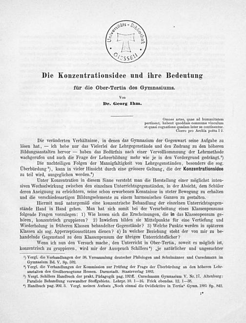 Die Konzentrationsidee und ihre Bedeutung für die Ober-Tertia des Gymnasiums / von Georg Ihm