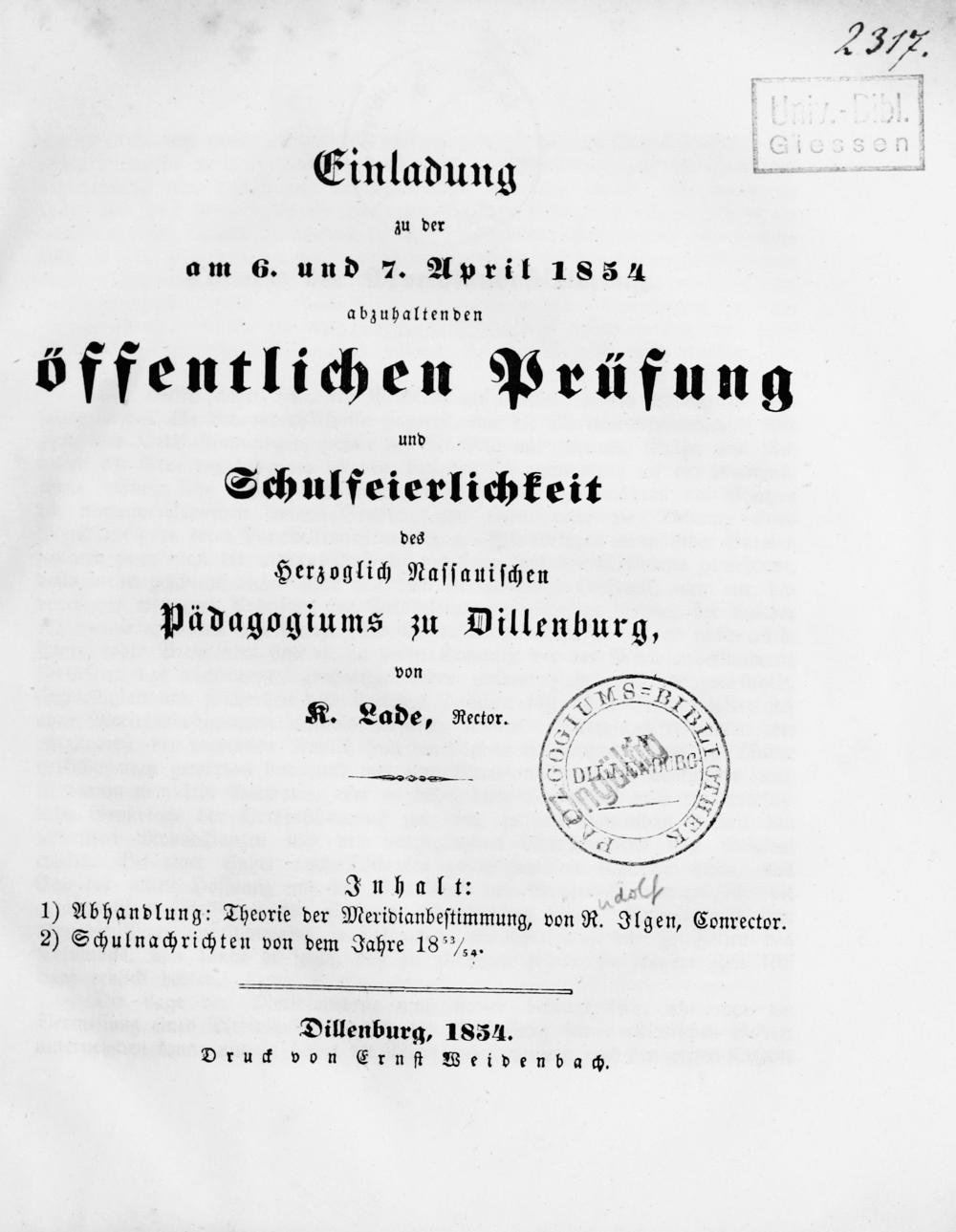 Einladung zu der am ... abzuhaltenden öffentlichen Prüfung und Schulfeierlichkeit des Herzoglich-Nassauischen Pädagogiums zu Dillenburg