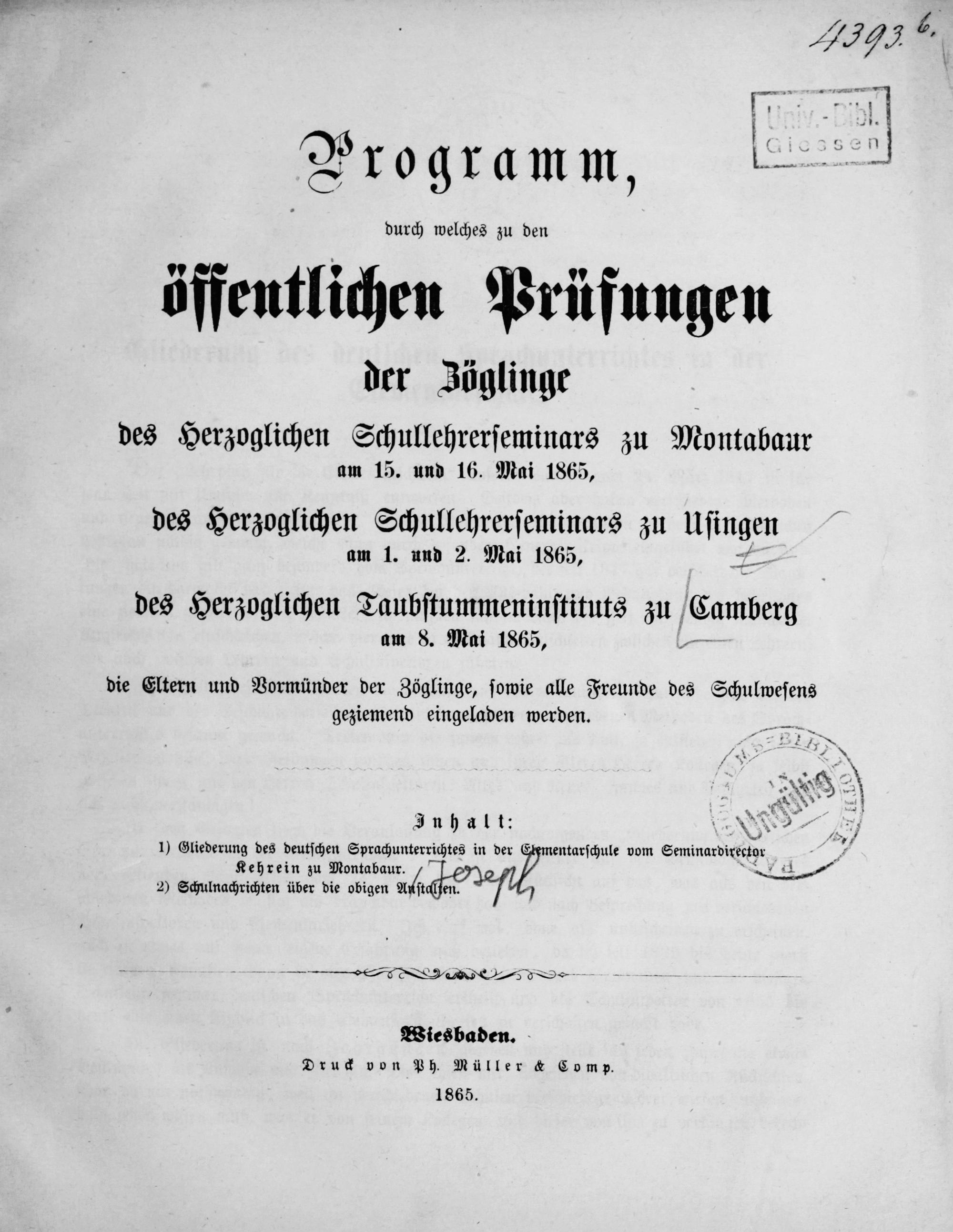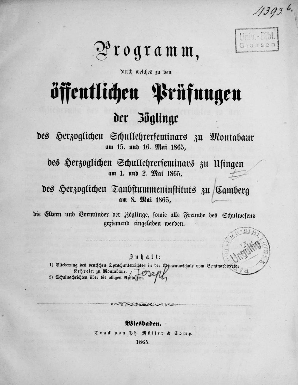 Programm, durch welches zu den öffentlichen Prüfungen der Zöglinge des Königlichen Schullehrer-Seminars zu Montabaur am ..., des Königlichen Schullehrerseminars zu Usingen am ..., des Königlichen Taubstummen-Instituts zu Camberg am ..., die Eltern und Vormünder der Zöglinge, sowie alle Freunde des Schulwesens geziemend eingeladen werden