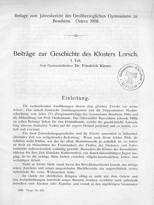 Beiträge zur Geschichte des Klosters Lorsch : 1. Teil / Friedrich Kieser