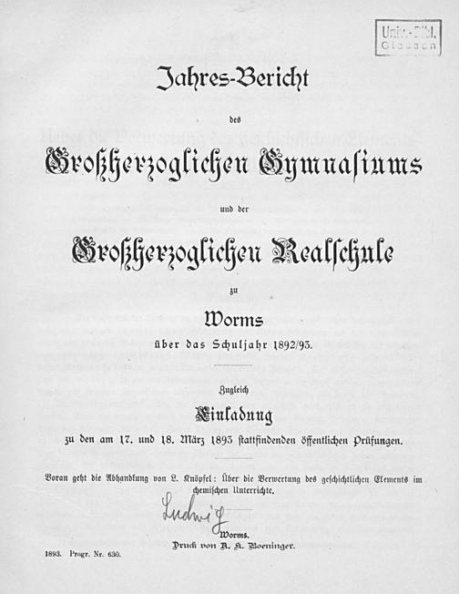 Jahresbericht des Großherzoglichen Gymnasiums und der Großherzoglichen Realschule zu Worms