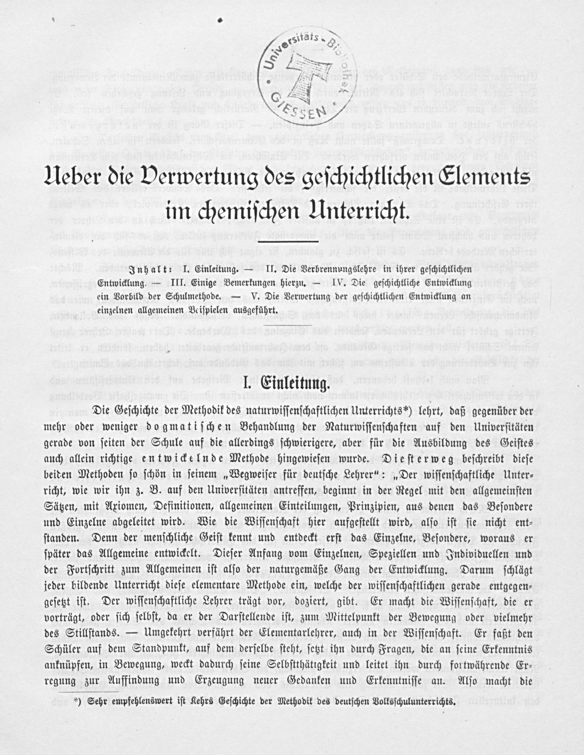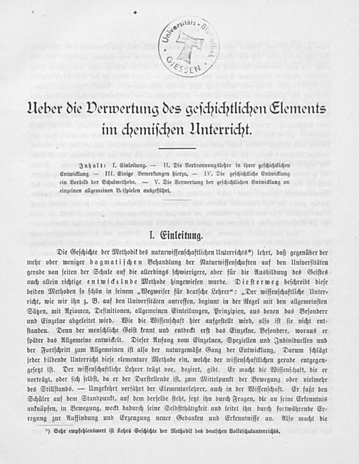 Ueber die Verwertung des geschichtlichen Elements im chemischen Unterricht
