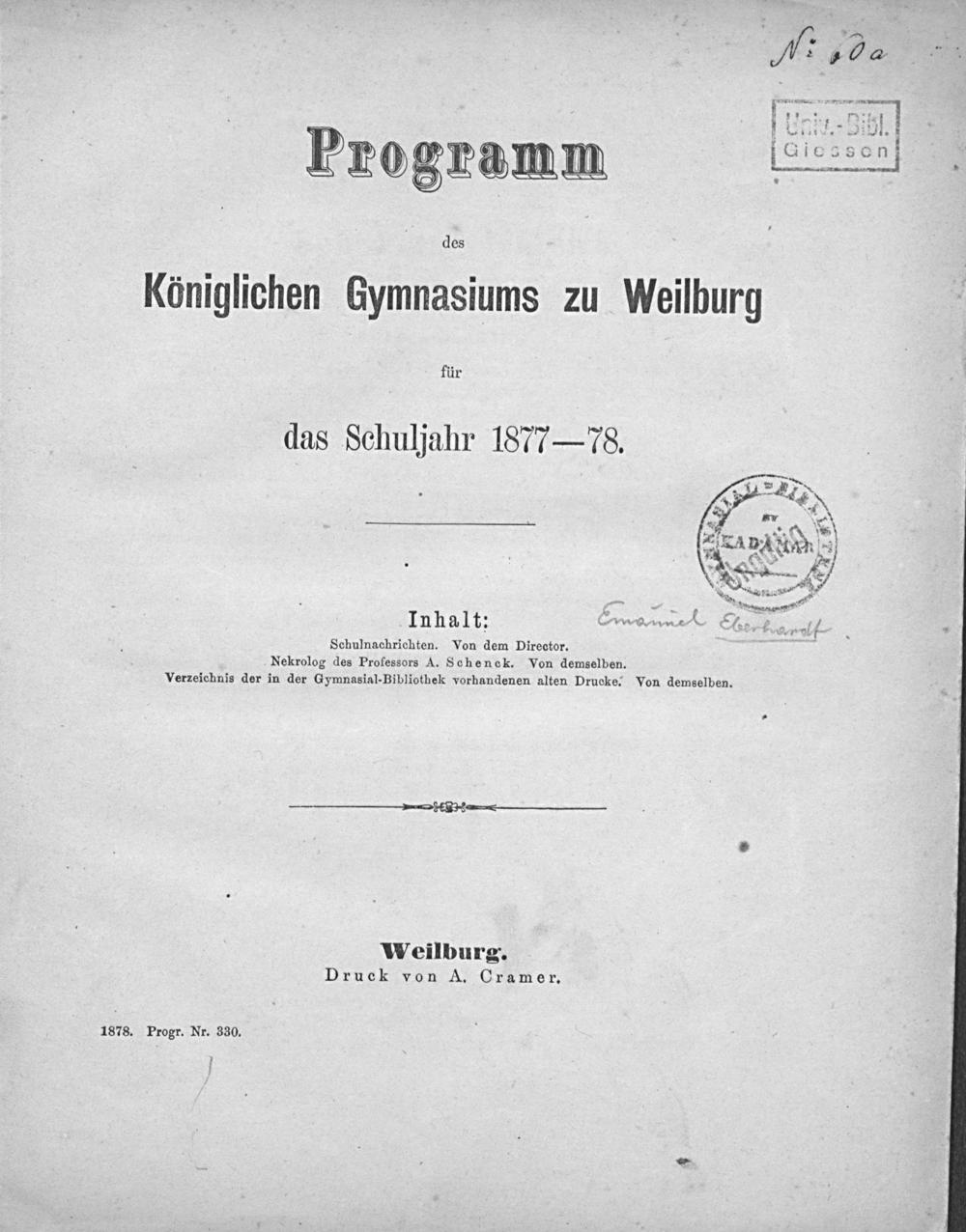 Programm des Königlichen Gymnasiums zu Weilburg