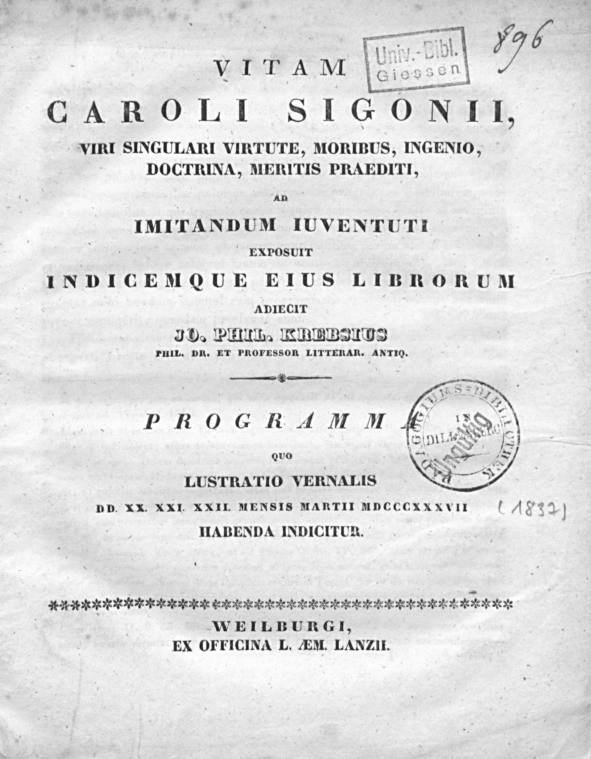 Vitam Caroli Sigonii : viri singulari virtute, moribus, ingenio, doctrina, meritis praediti, ad imitandum iuventuti exposuit indicemque eius librorum / adiecit Jo. Phil. Krebsius