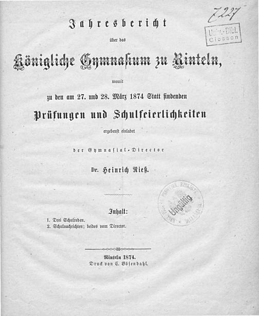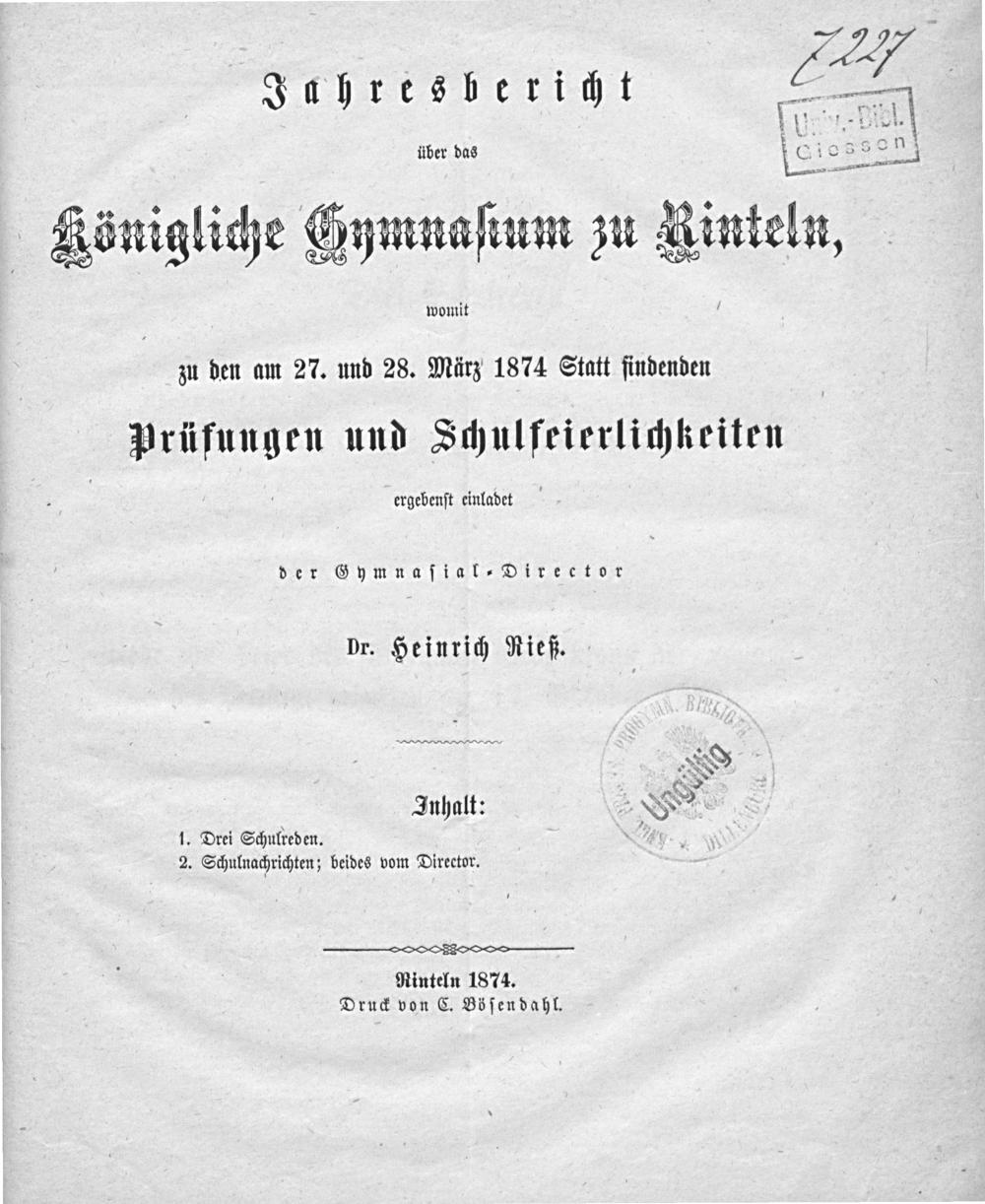 Drei Schulreden. 1) Rede zur Feier des 50. Gedenktages der Schlacht bei Leipzig, gehalten am 17. Okt. 1863. 2) Rede, gehalten am 31. Okt. 1867 bei der 50jährigen Jubilarfeier der Gründung des Gymnasiums und dem Amtsjubiläum des Schreib- und Zeichenlehrers Storck. 3) Rede, gehalten am 22. März 1870 bei der Feier des Geburtstages Sr. Majestät des Königs / Heinrich Rieß