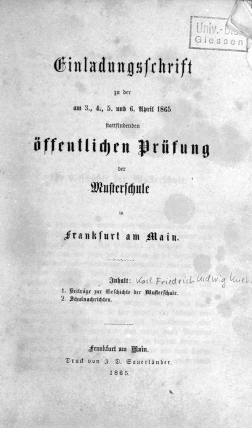 Einladungsschrift zu der ... stattfindenden öffentlichen Prüfung der Musterschule in Frankfurt am Main
