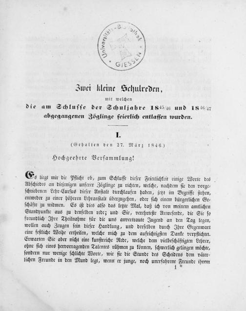 Zwei kleine Schulreden, mit welchen die am Schlusse der Schuljahre 1845/46 und 1846/47 abgegangenen Zöglinge feierlich entlassen wurden