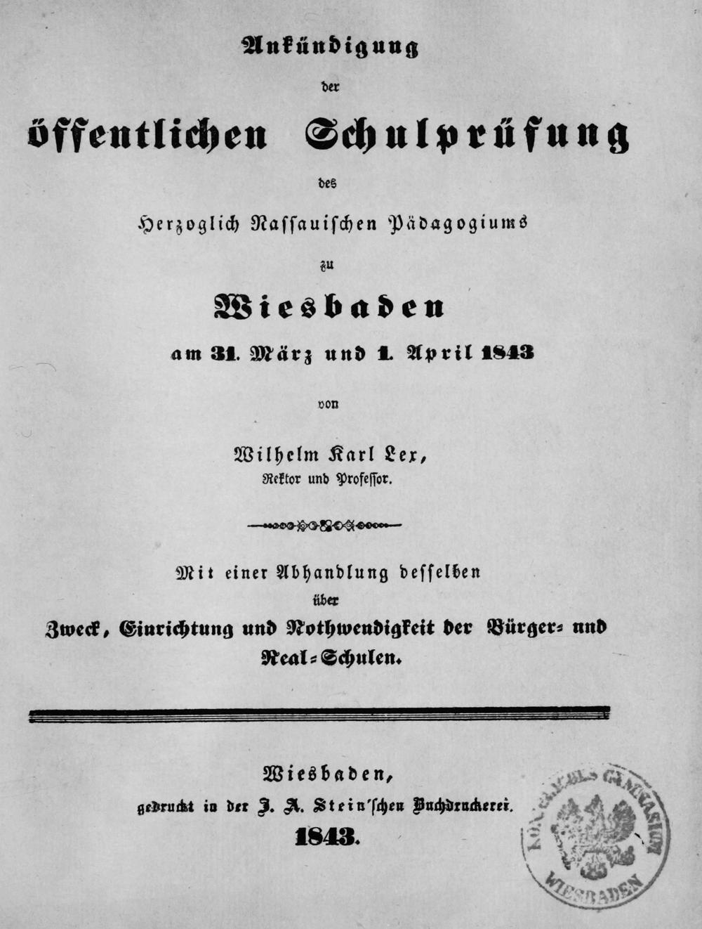 Ankündigung der öffentlichen Schulprüfung des Herzoglich-Nassauischen Pädagogiums zu Wiesbaden