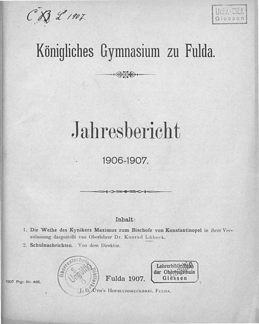 Die Weihe des Kynikers Maximus zum Bischof von Konstantinopel in ihrer Veranlassung dargestellt / von Konrad Lübeck