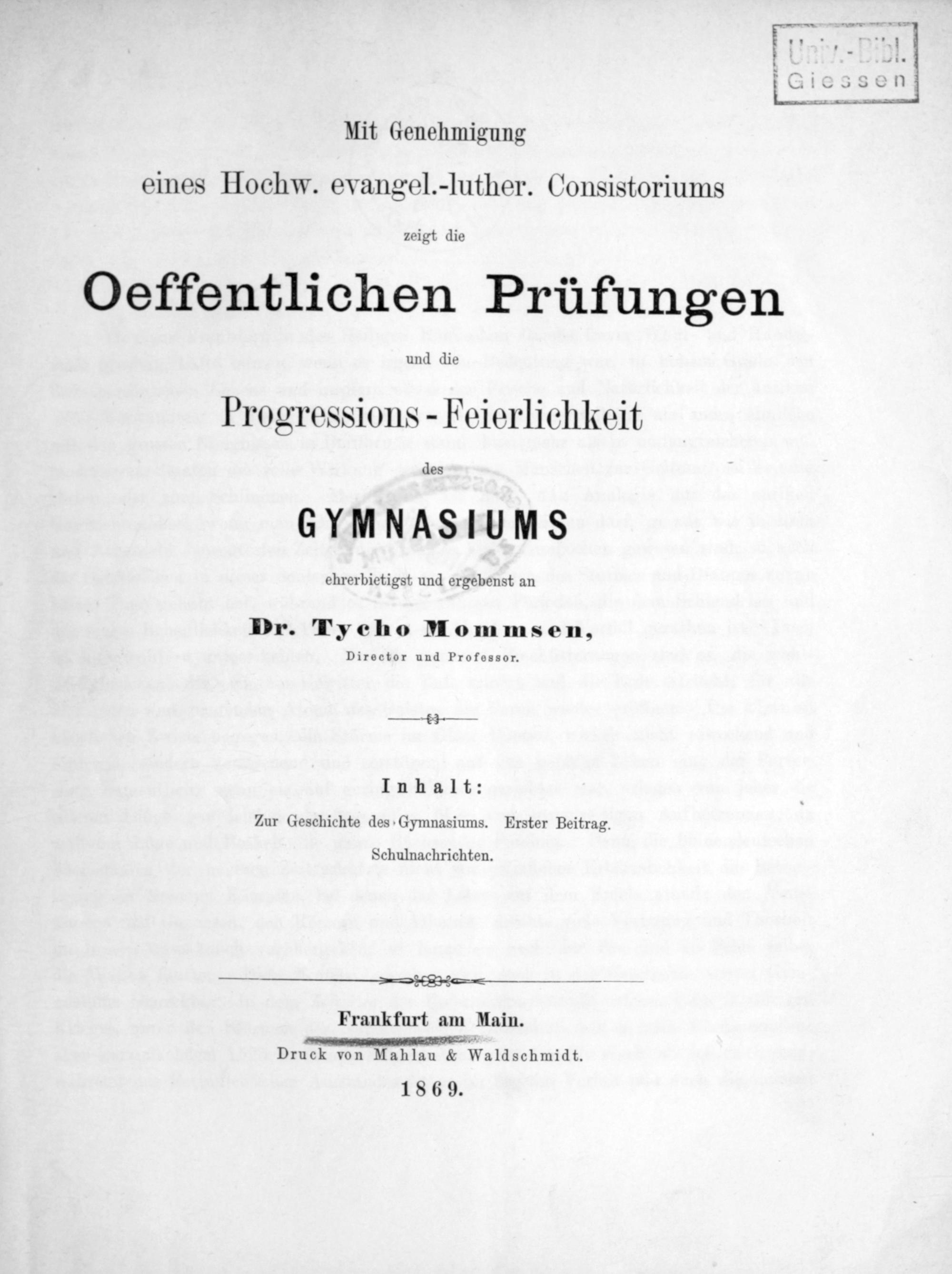 Mit Genehmigung eines hochw. evangel.-luther. Consistoriums zeigt die oeffentlichen Prüfungen und die Progressions-Feierlichkeit des Gymnasiums ehrerbietigst und ergebenst an