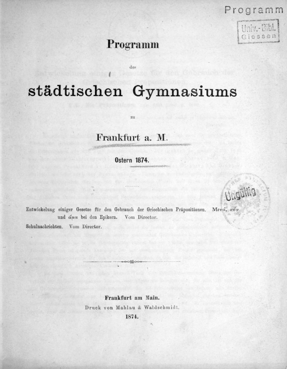 Programm des Städtischen Gymnasiums in Frankfurt a.M.
