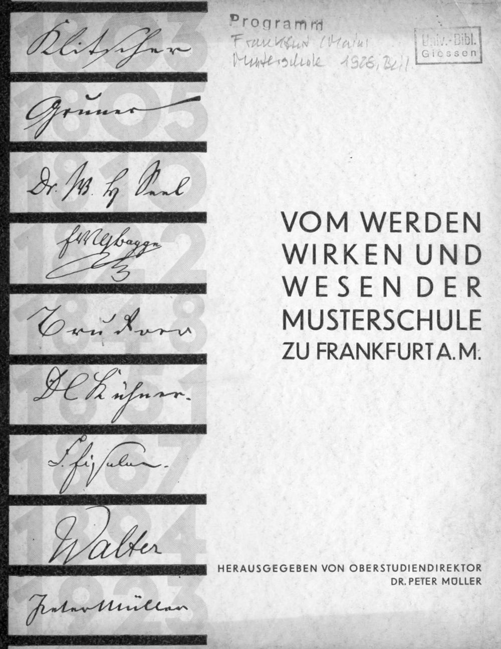 Vom Werden, Wirken und Wesen der Musterschule. Festgabe zum einhundertfünfundzwanzigjährigen Jubiläum 1803-1928 / hrsg. von Peter Müller