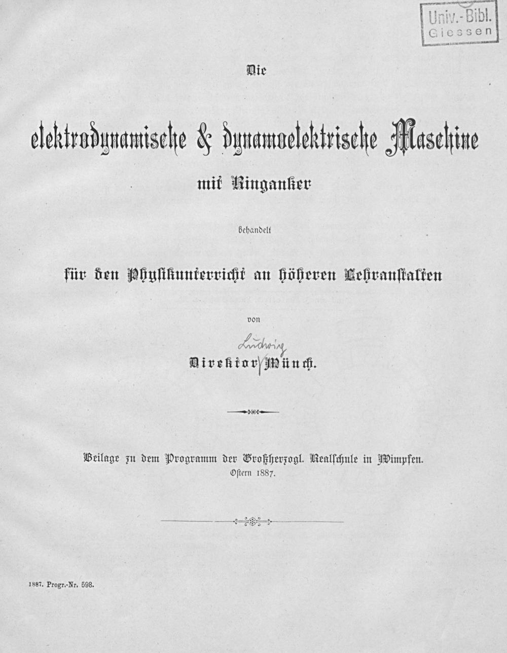 Die elektrodynamische & dynamoelektrische Maschine mit Ringanker : behandelt für den Physikunterricht an höheren Lehranstalten / von Direktor Münch