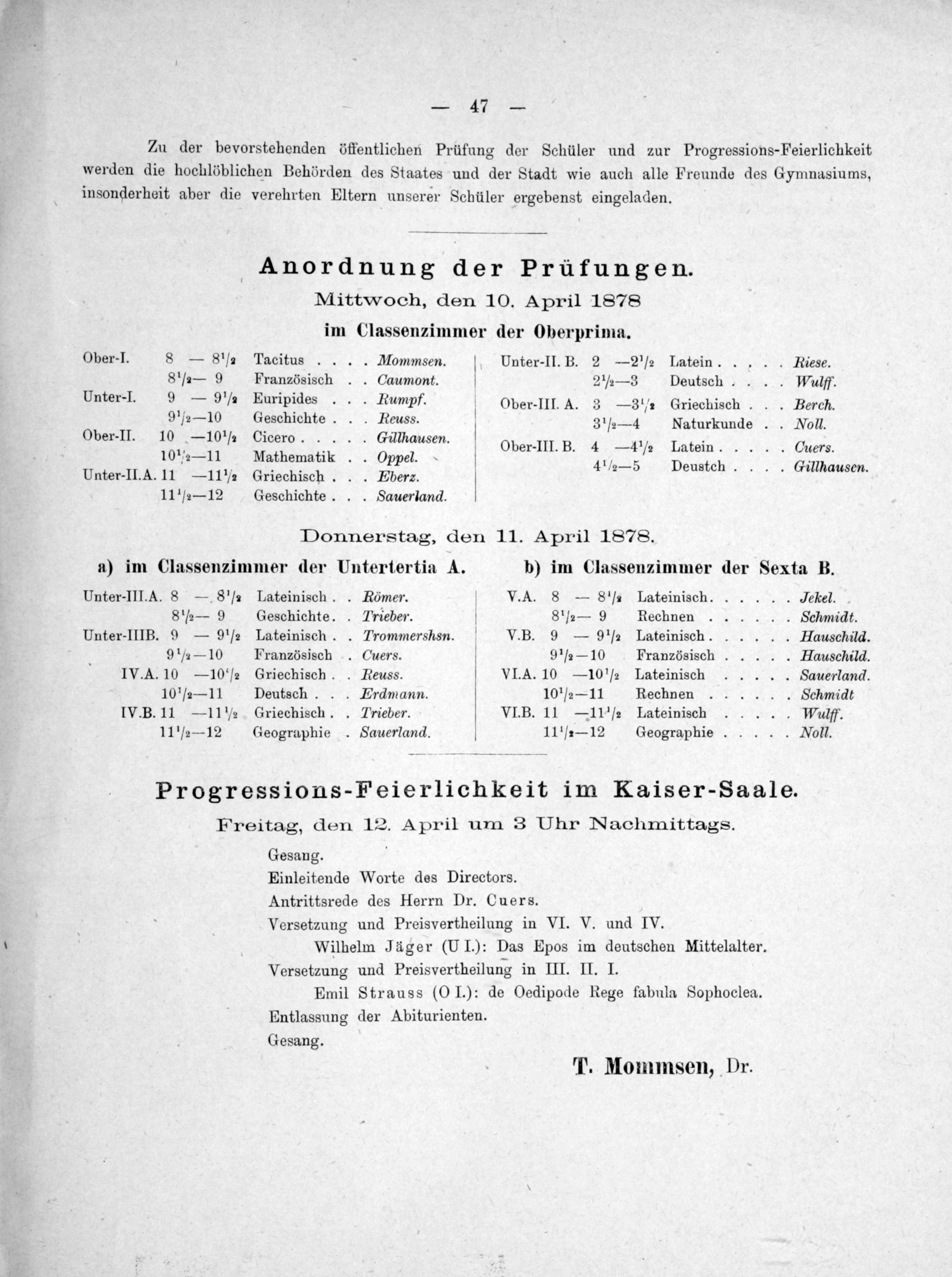 Programm des Städtischen Gymnasiums in Frankfurt a.M.