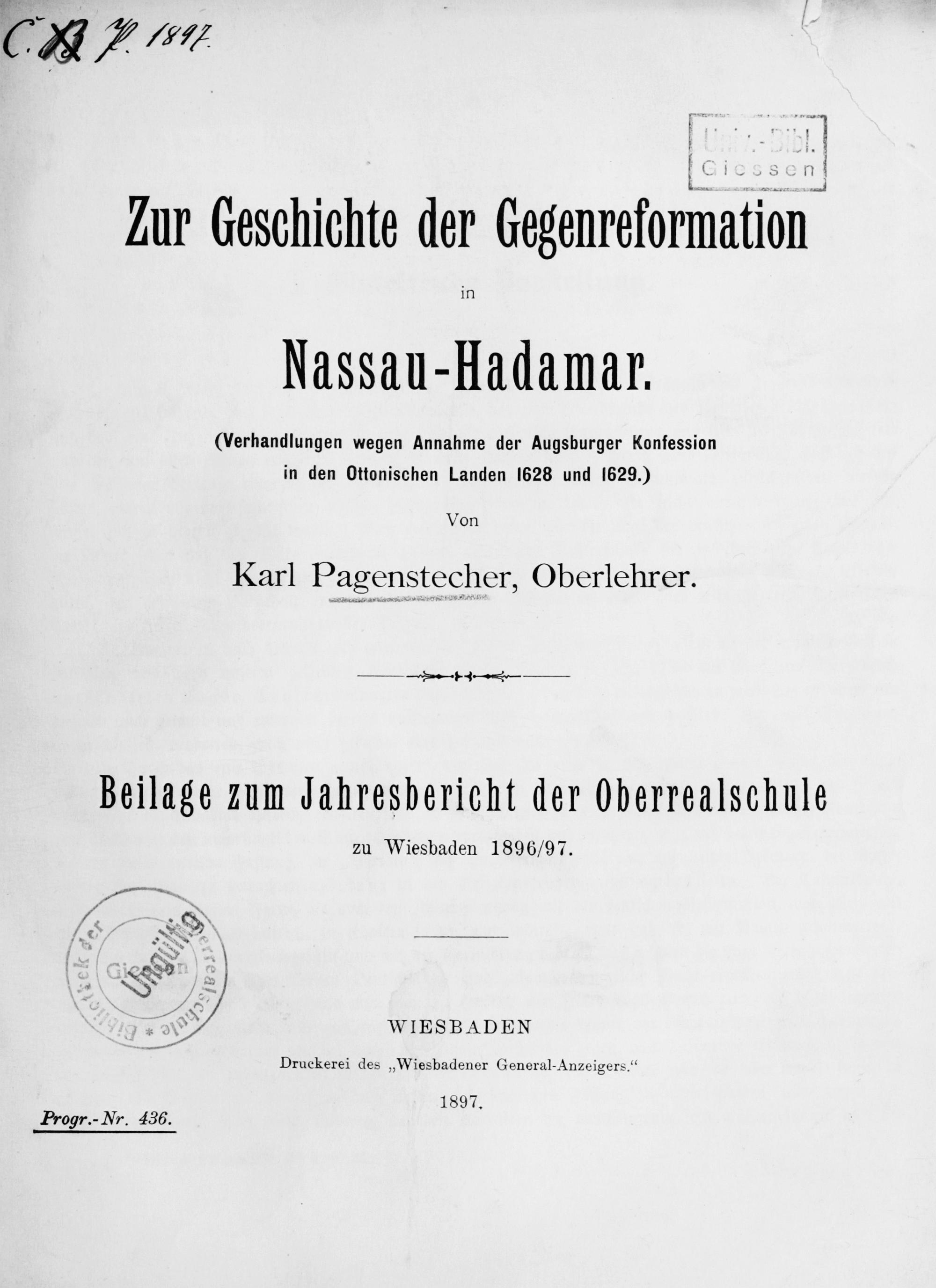 Zur Geschichte der Gegenreformation in Nassau-Hadamar. (Verhandlungen wegen Annahme der Augsburger Konfession in den Ottonischen Landen 1628 und 1629.)