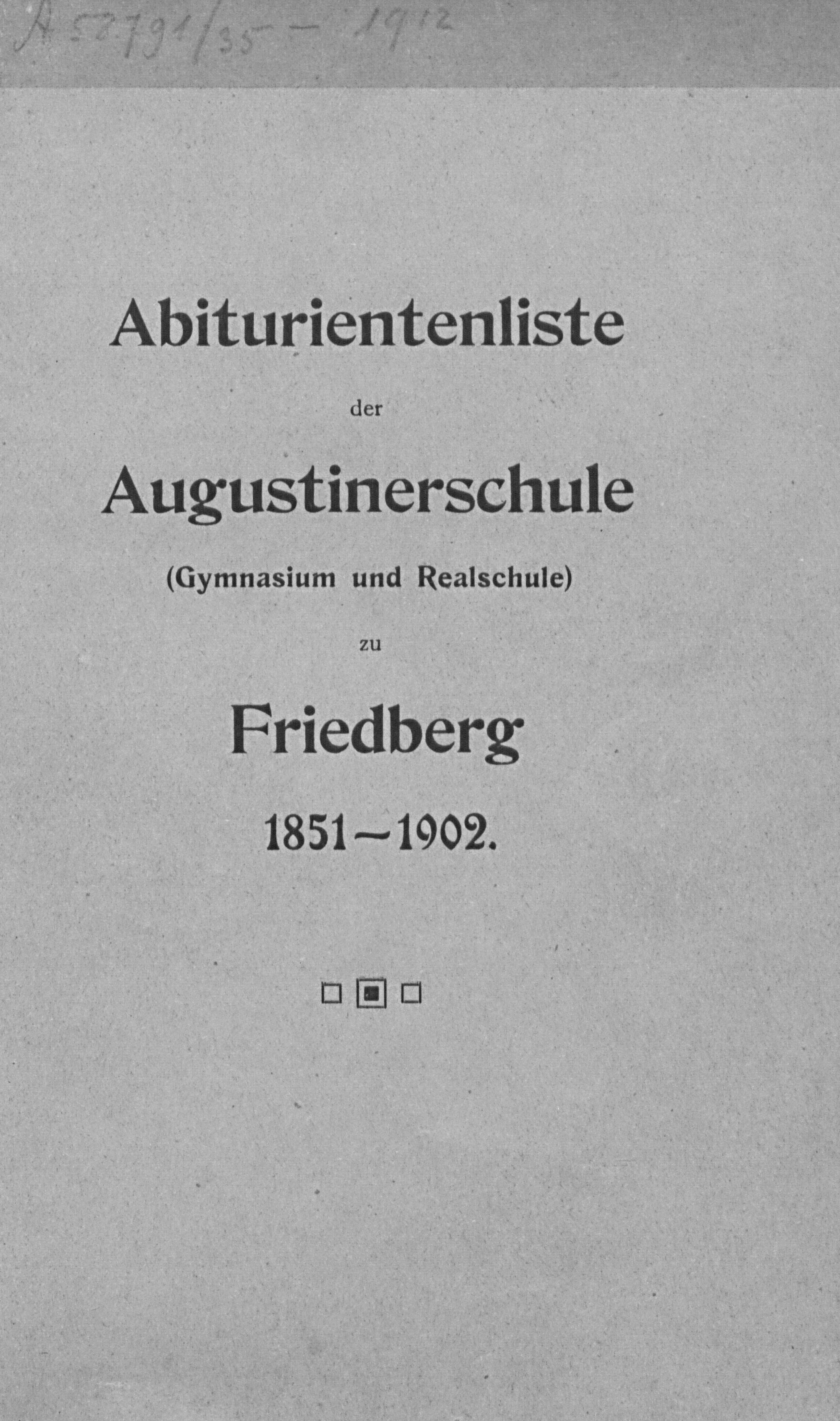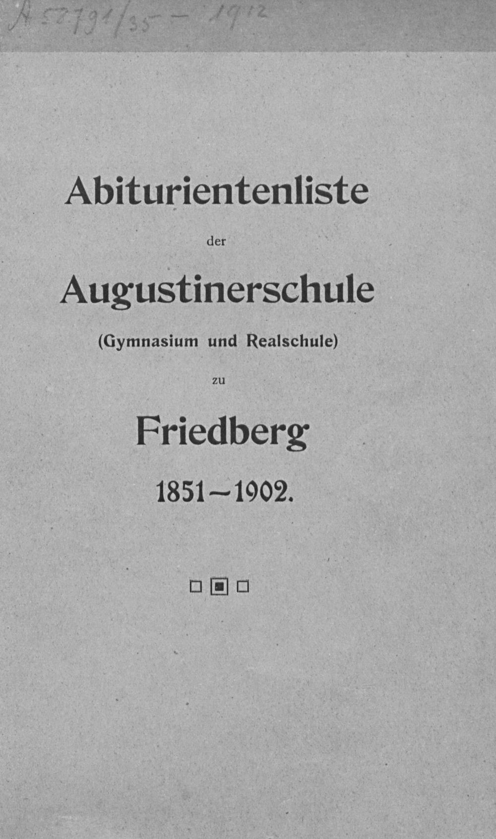Abiturientenliste der Augustinerschule (Gymnasium und Realschule) zu Friedberg/Hessen 1851 - 1902