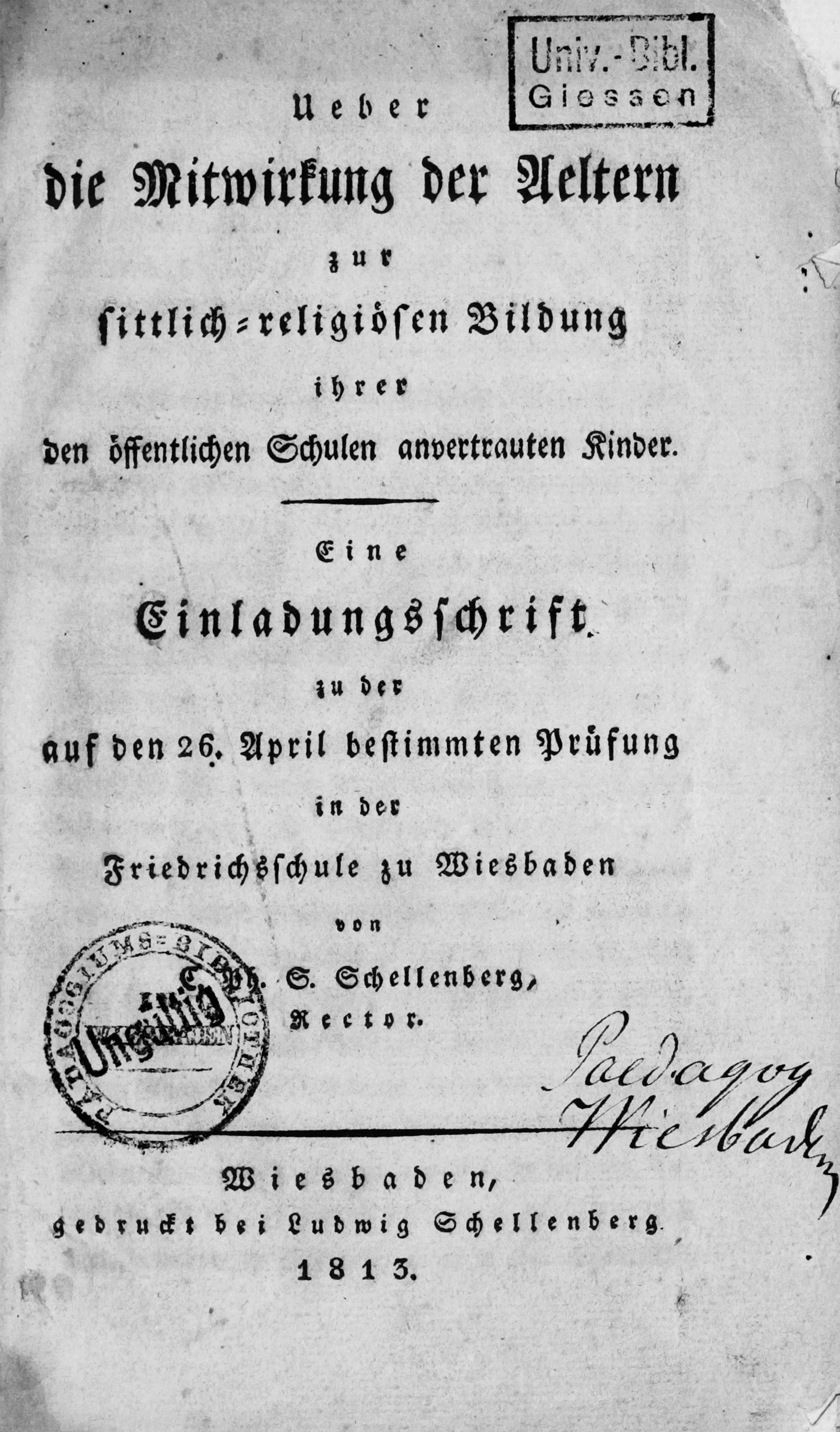 Eine Einladungsschrift zu der auf den ... bestimmten Prüfung in der Friedrichsschule zu Wiesbaden