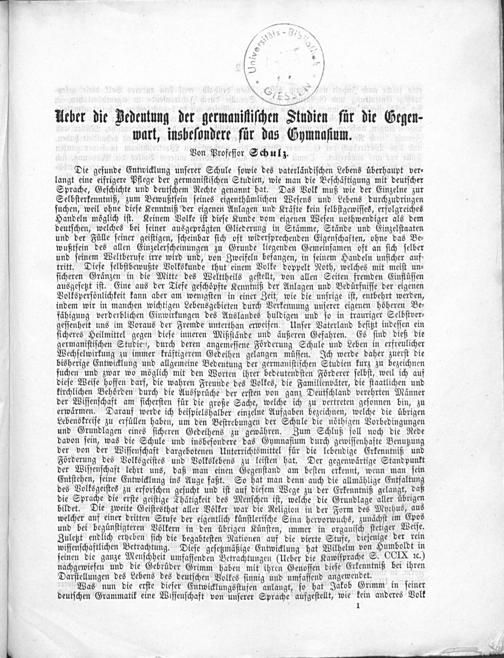 Ueber die Bedeutung der germanistischen Studien für die Gegenwart, insbesondere für das Gymnasium / von Schulz