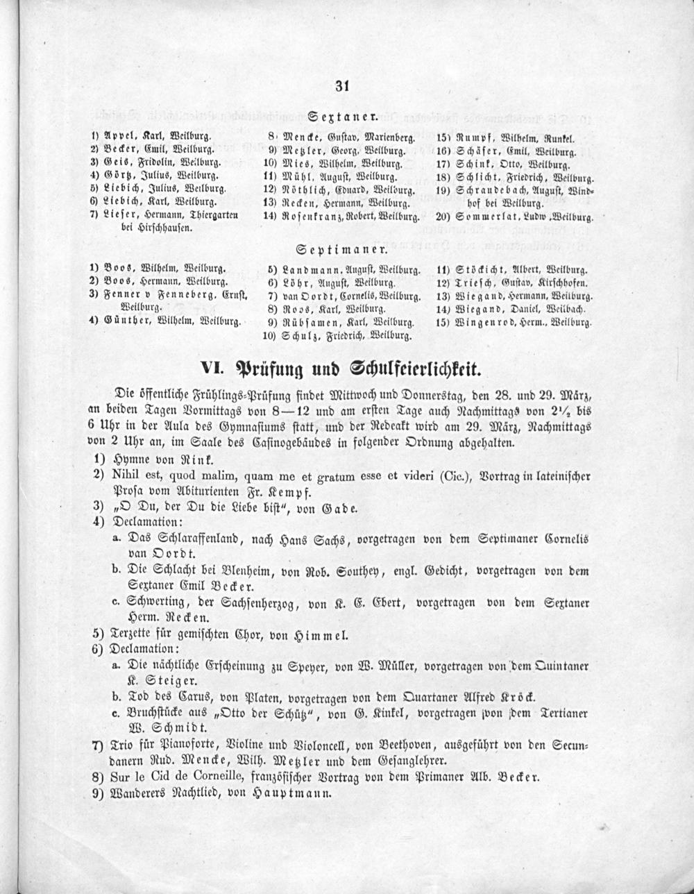 Ankündigung der öffentlichen Frühlingsprüfung im Herzoglich-Nassauischen Gymnasium zu Weilburg