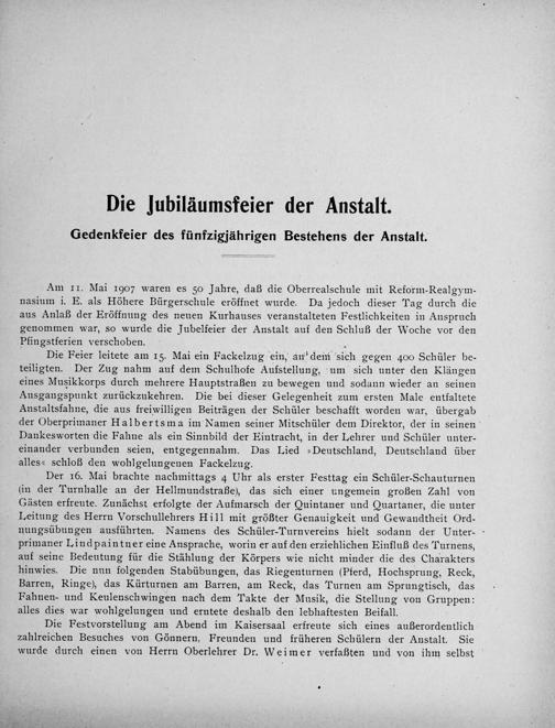 Die Jubiläumsfeier der Anstalt. Gedenkfeier des fünfzigjährigen Bestehens der Anstalt