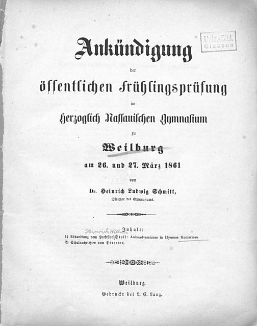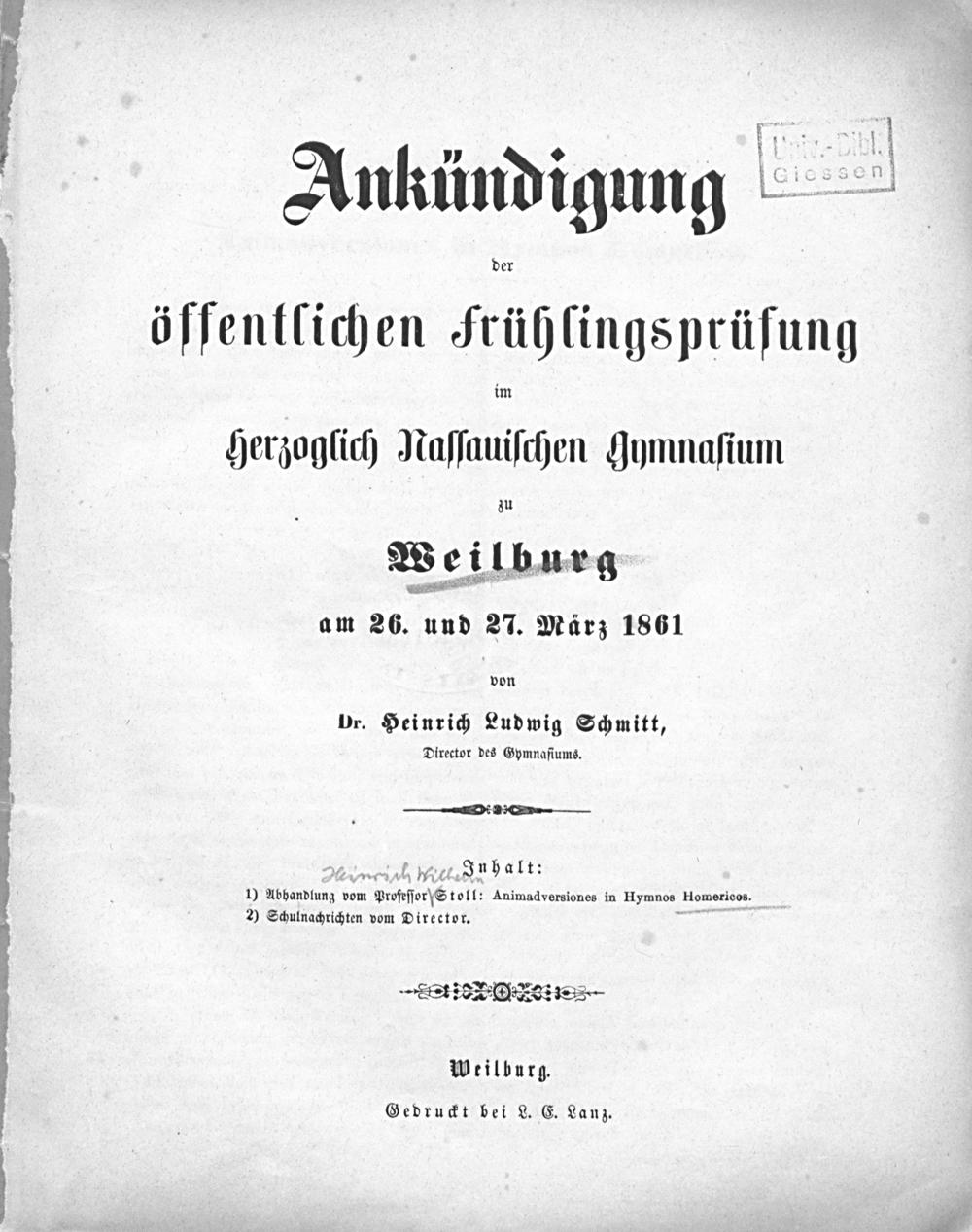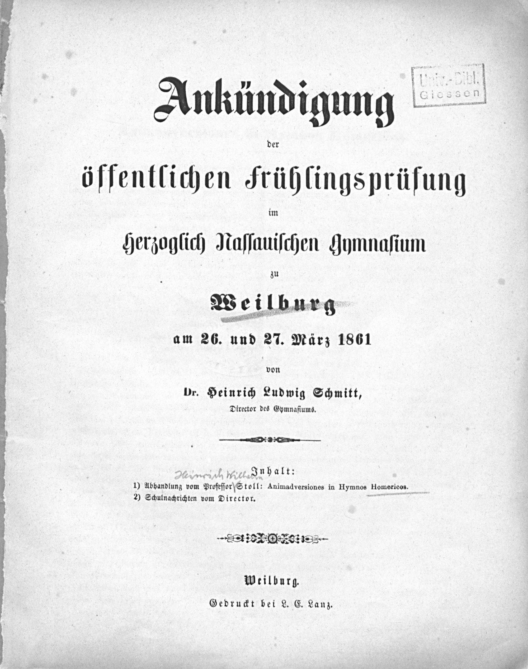 Ankündigung der öffentlichen Frühlingsprüfung im Herzoglich-Nassauischen Gymnasium zu Weilburg