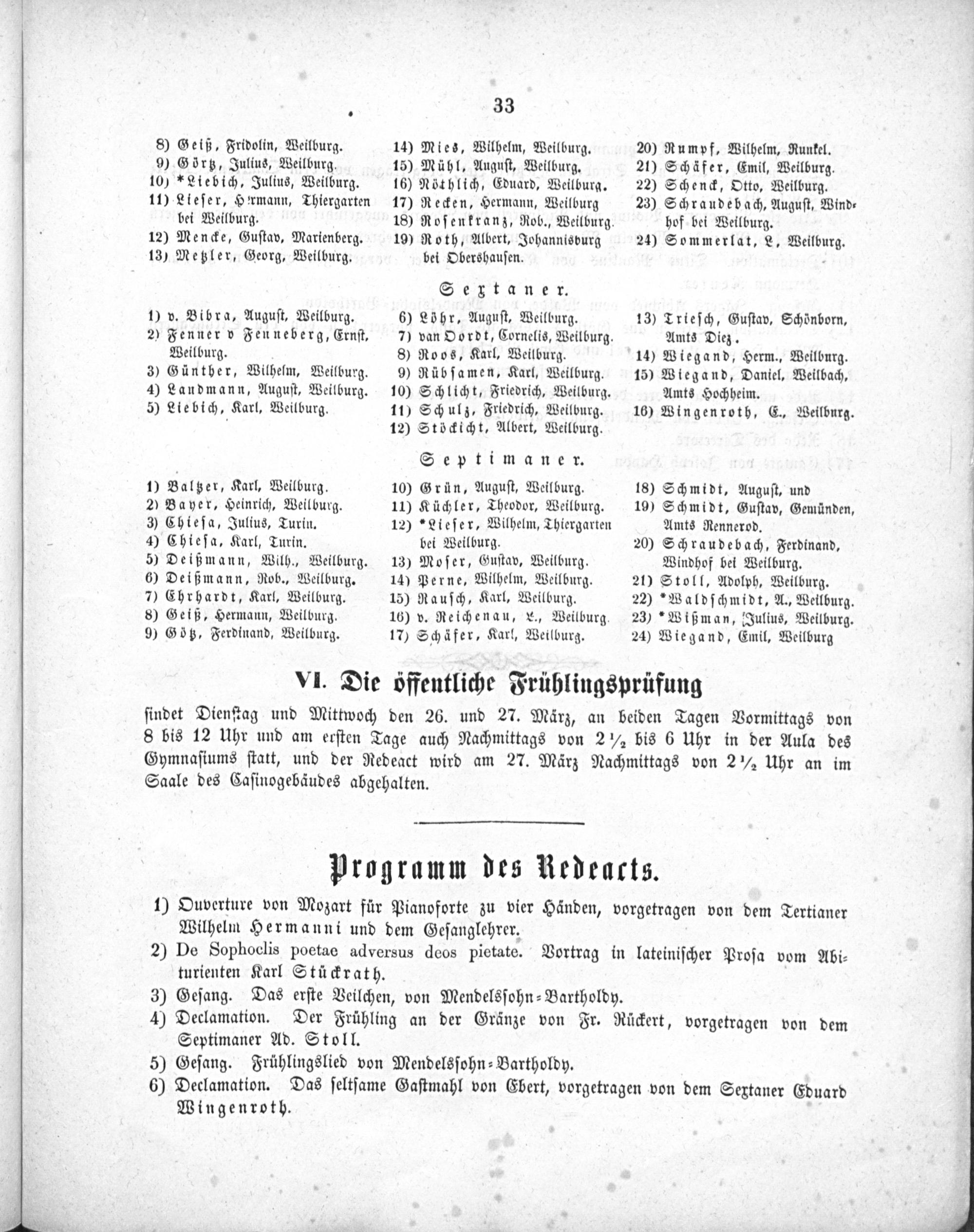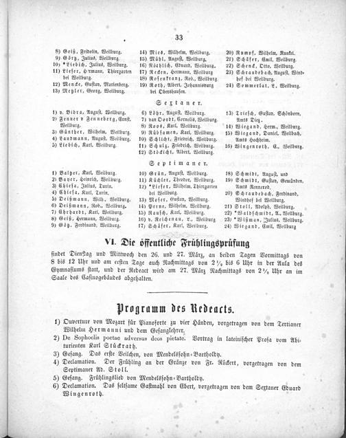 Ankündigung der öffentlichen Frühlingsprüfung im Herzoglich-Nassauischen Gymnasium zu Weilburg