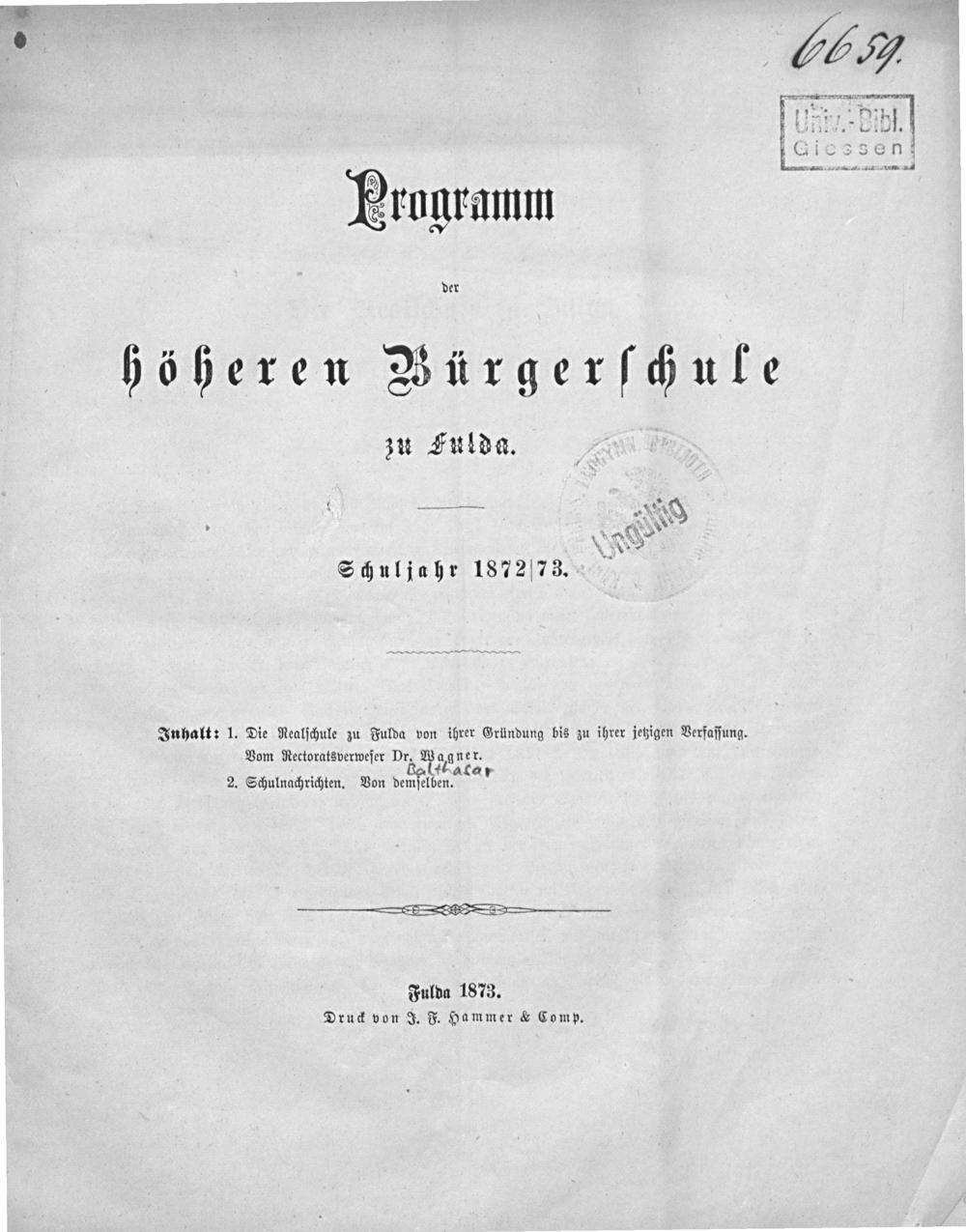 Die Realschule zu Fulda von ihrer Gründung bis zu ihrer jetzigen Verfassung / von Dr. Wagner