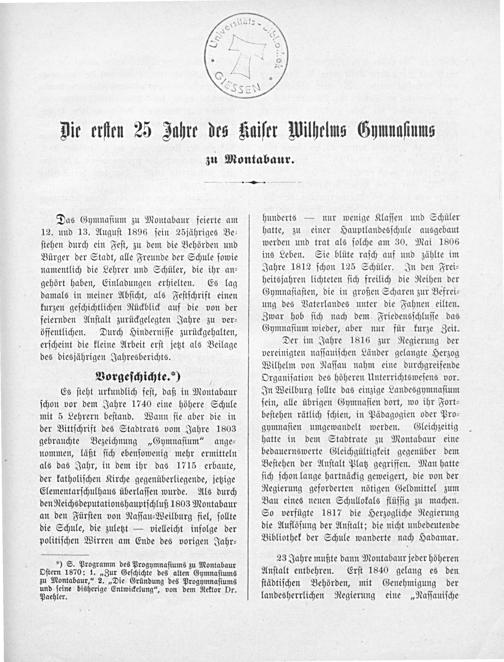Die ersten 25 Jahre des Kaiser Wilhelms Gymnasiums zu Montabaur