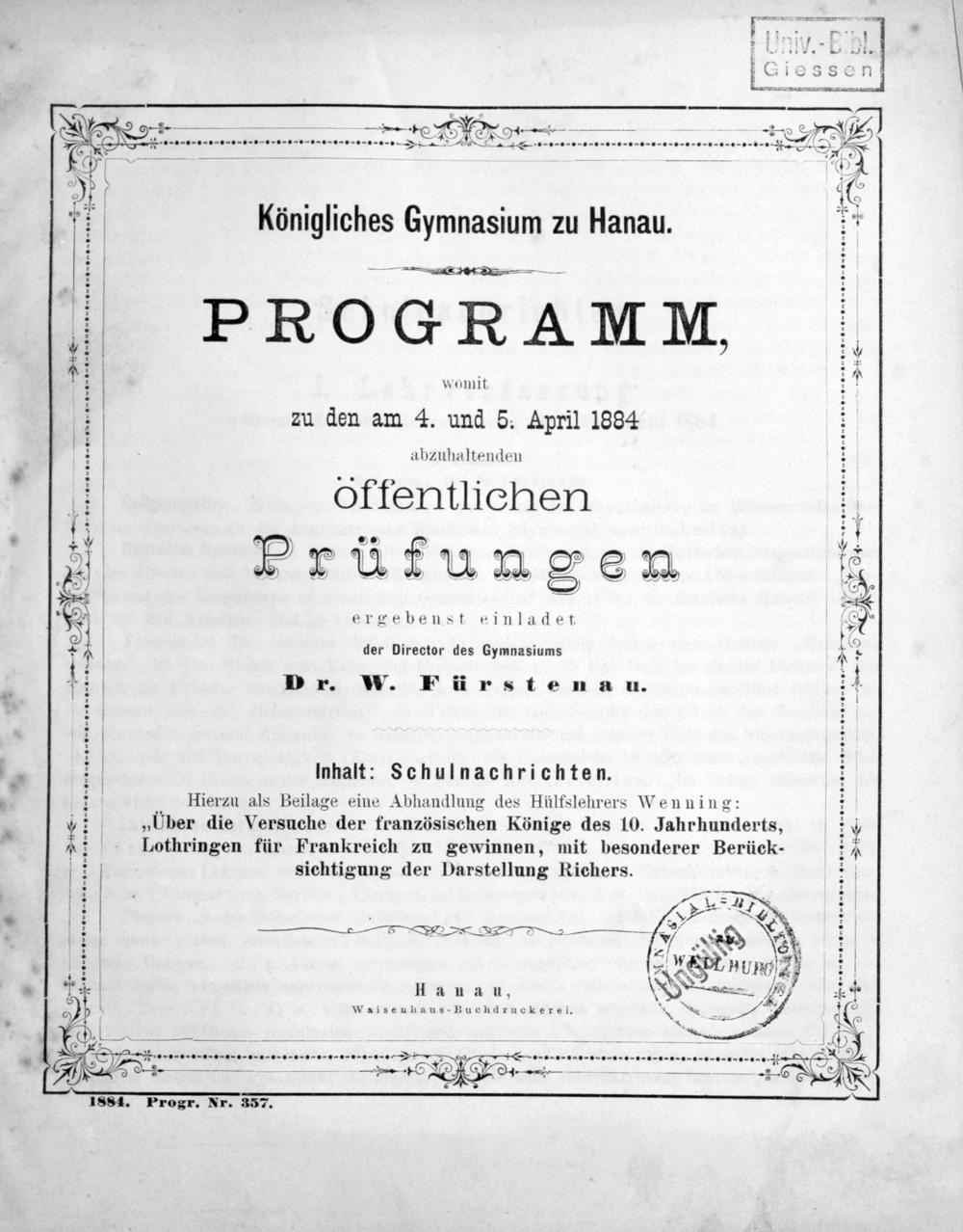 Über die Bestrebungen der französischen Könige des 10. Jahrhunderts Lothringen für Frankreich zu gewinnen : mit besonderer Berücksichtigung der Darstellung Richers / von V. Wenning