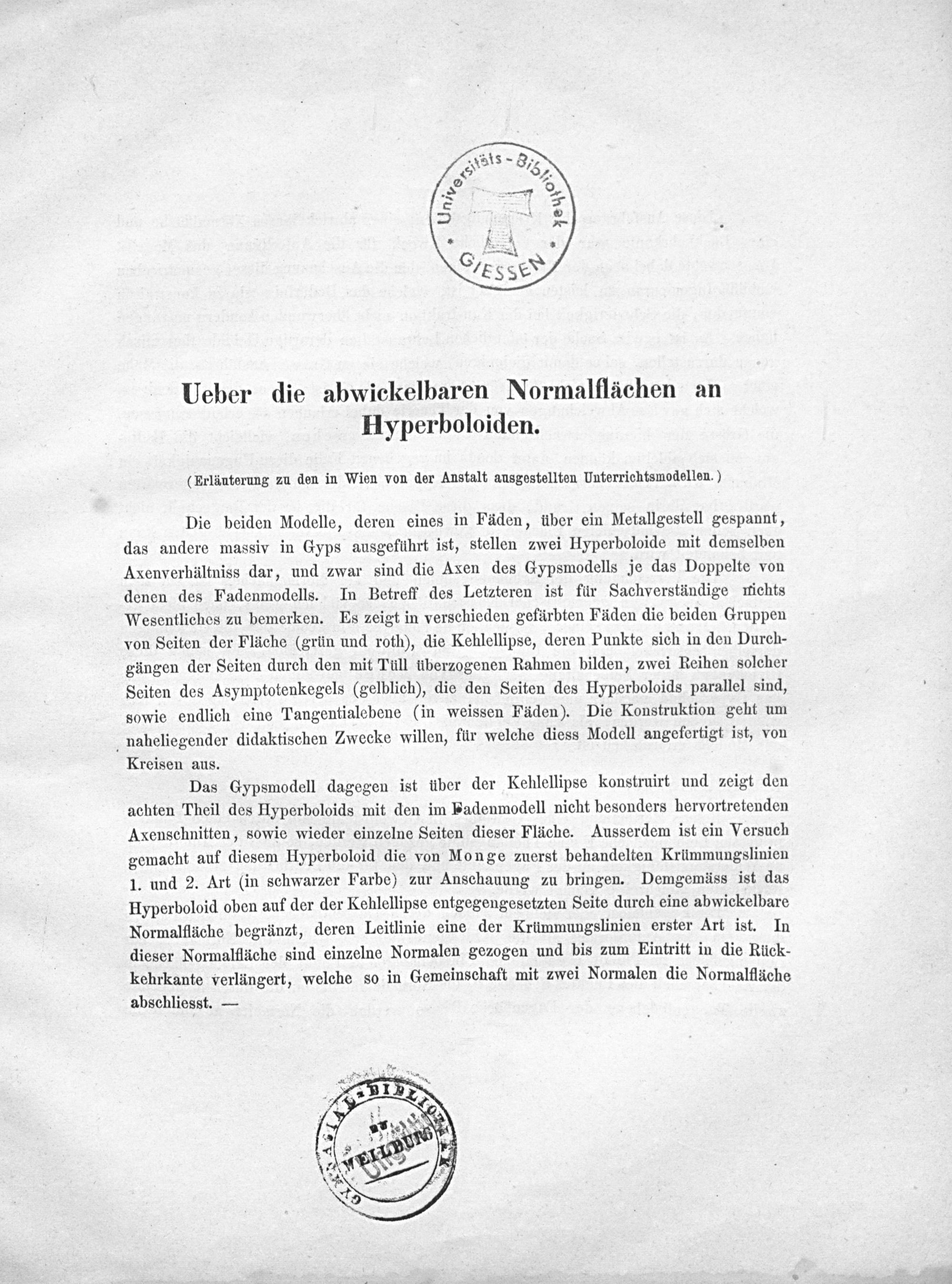 Ueber die abwickelbaren Normalflächen an Hyperboloiden :