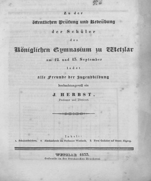 Zu der öffentlichen Prüfung, dem Rede-Actus und der Abiturienten-Entlassung des Königlichen Gymnasiums zu Wetzlar ... ladet ... ergebenst ein