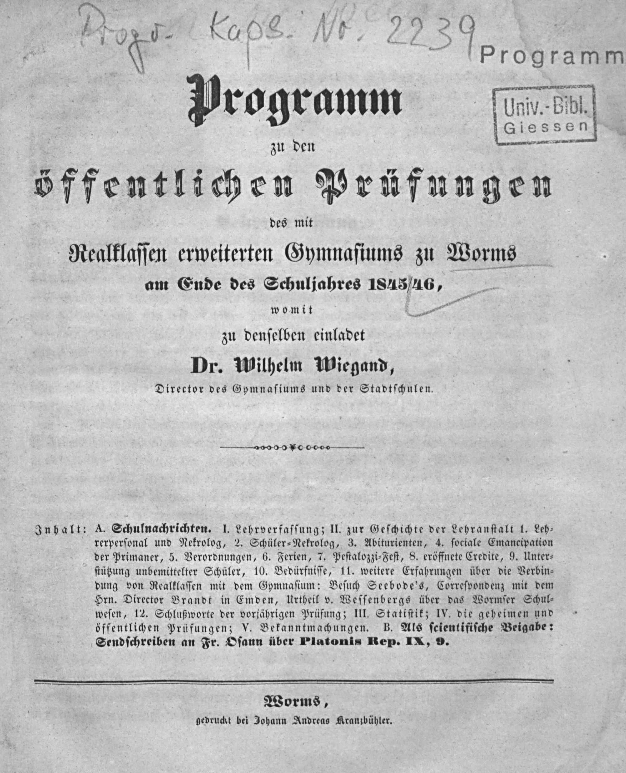 Programm, womit zu der öffentlichen Prüfung des durch Realklassen erweiterten Gymnasiums zu Worms im Frühjahr ... einladet