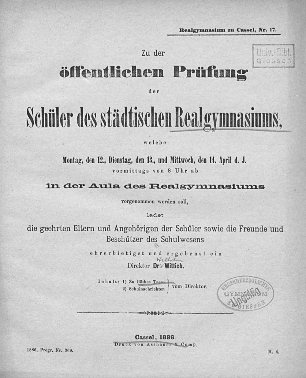 Zu der öffentlichen Prüfung der Schüler des Städtischen Realgymnasiums, welche ... in der Aula des Realgymnasiums vorgenommen werden soll, ladet ... ehrerbietigst und ergebenst ein