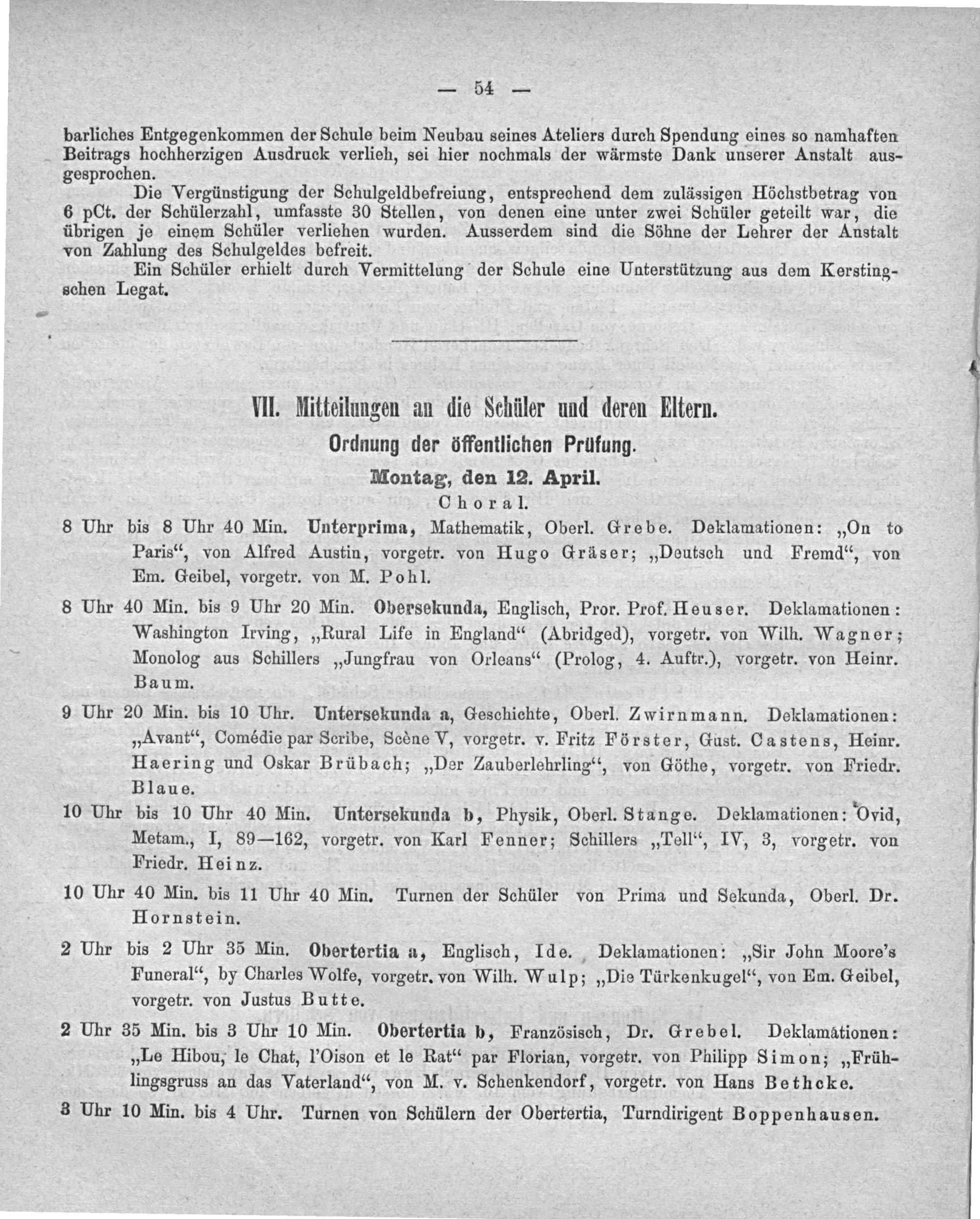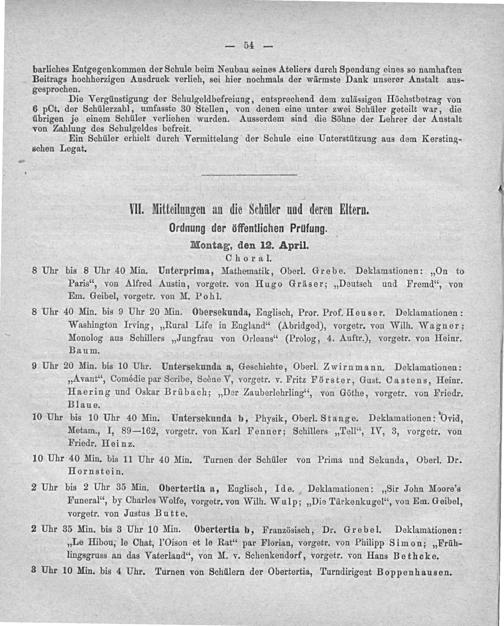 Zu der öffentlichen Prüfung der Schüler des Städtischen Realgymnasiums, welche ... in der Aula des Realgymnasiums vorgenommen werden soll, ladet ... ehrerbietigst und ergebenst ein