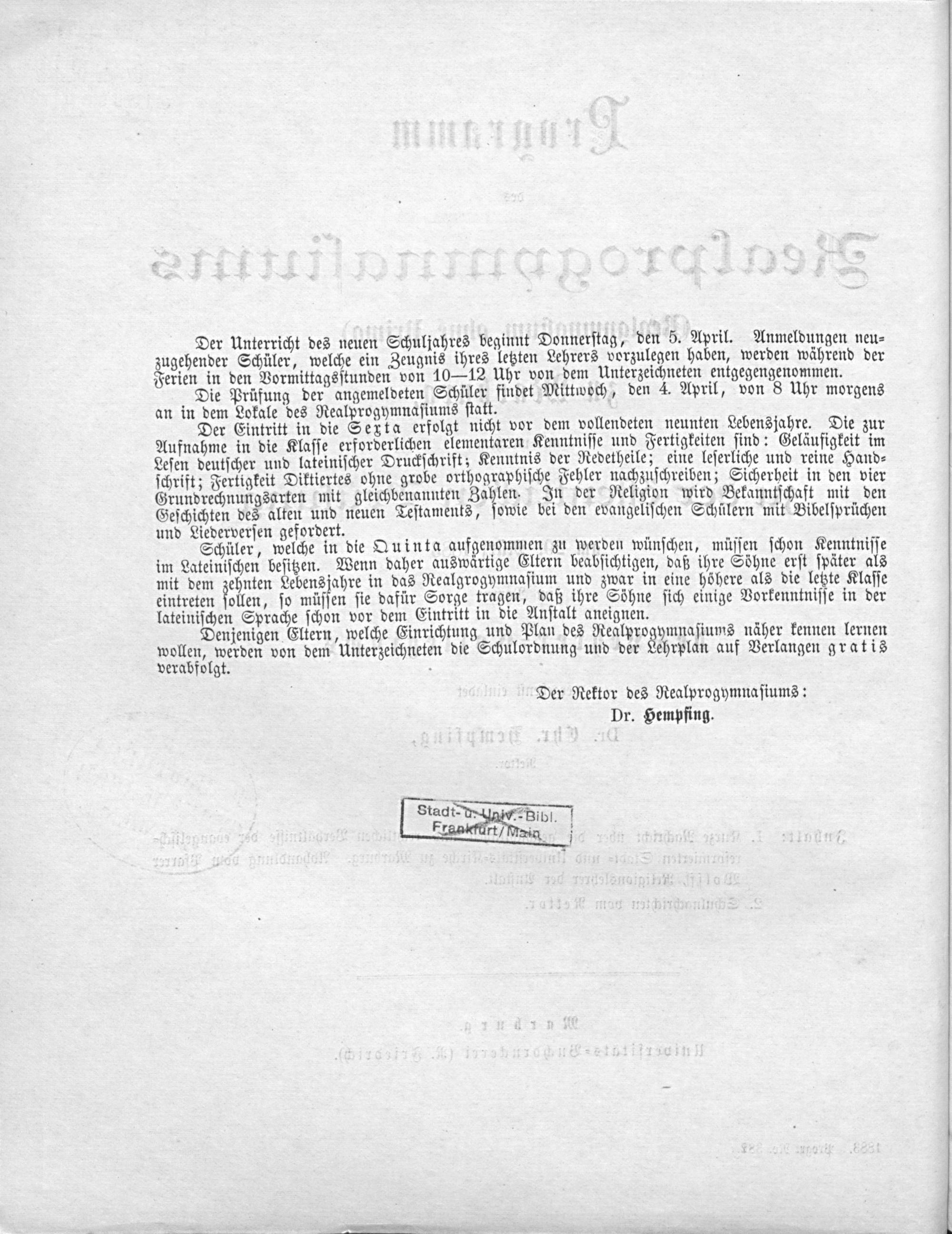 Programm des Realprogymnasiums (Realgymnasium ohne Prima) in Marburg