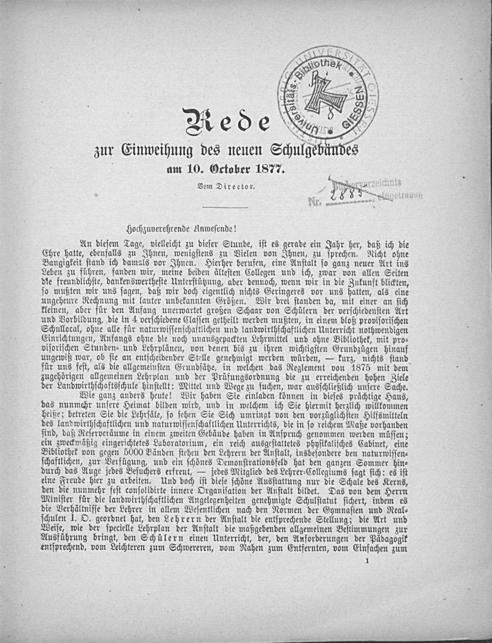 Rede zur Einweihung des neuen Schulgebäudes am 10. Oktober 1877