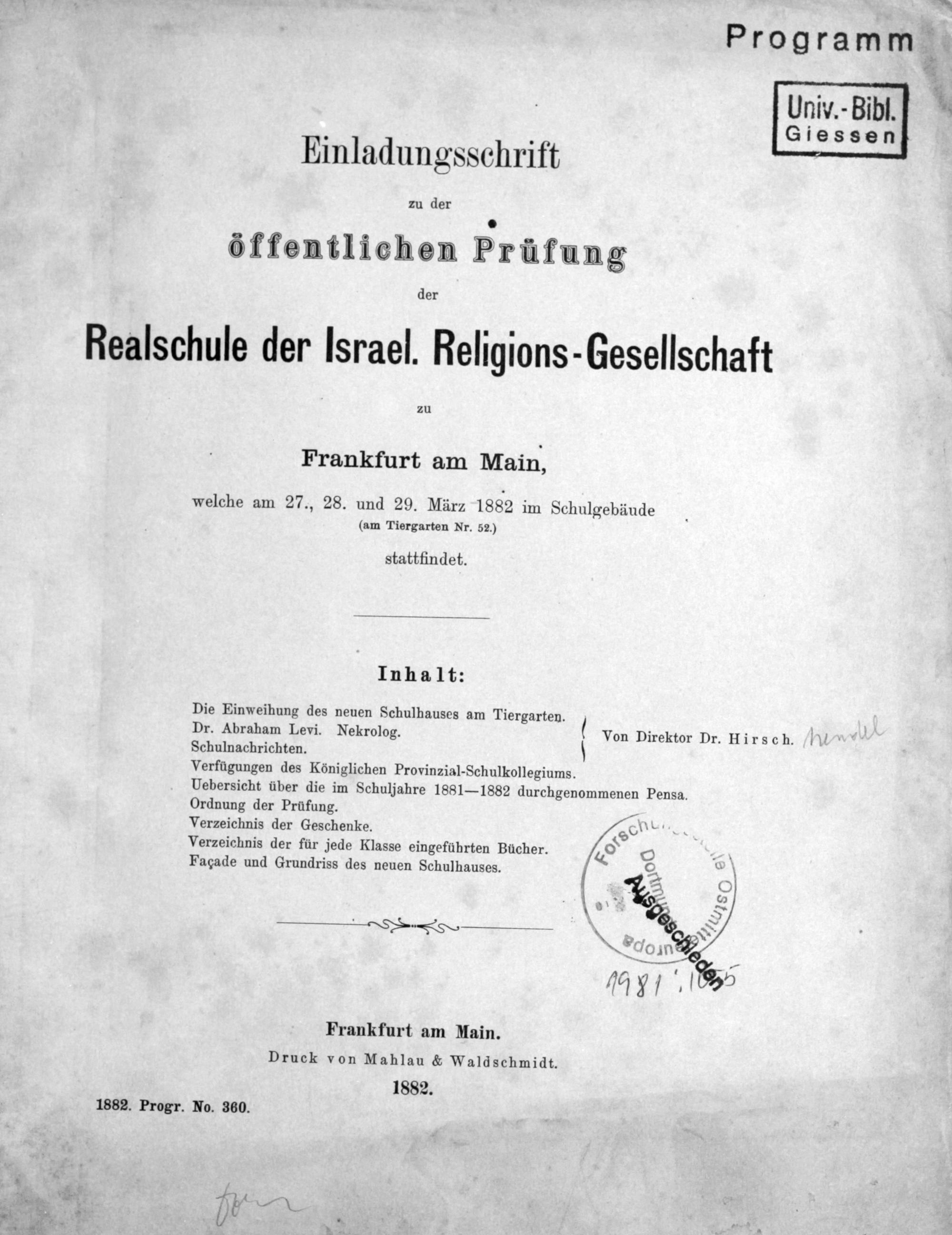 Einladungsschrift zu der öffentlichen Prüfung der Realschule der Israelitischen Religions-Gesellschaft zu Frankfurt am Main
