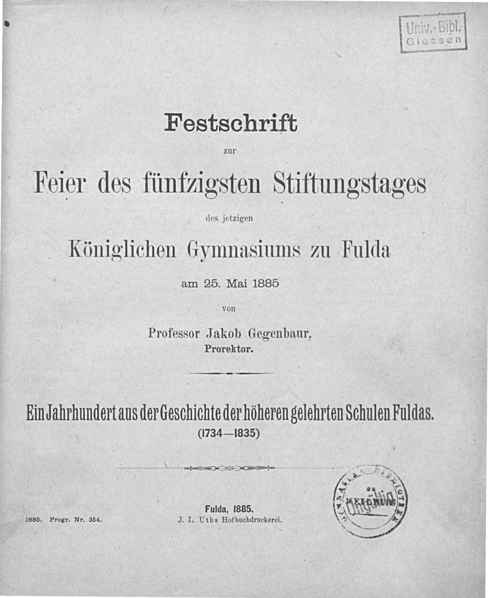 Ein Jahrhundert aus der Geschichte der höheren gelehrten Schulen Fuldas : 1734-1835 : Festschrift zur Feier des 50. Stiftungsfestes des jetzigen Königlichen Gymnasiums zu Fulda am 25. Mai 1885 / von Prof. Jakob Gegenbaur