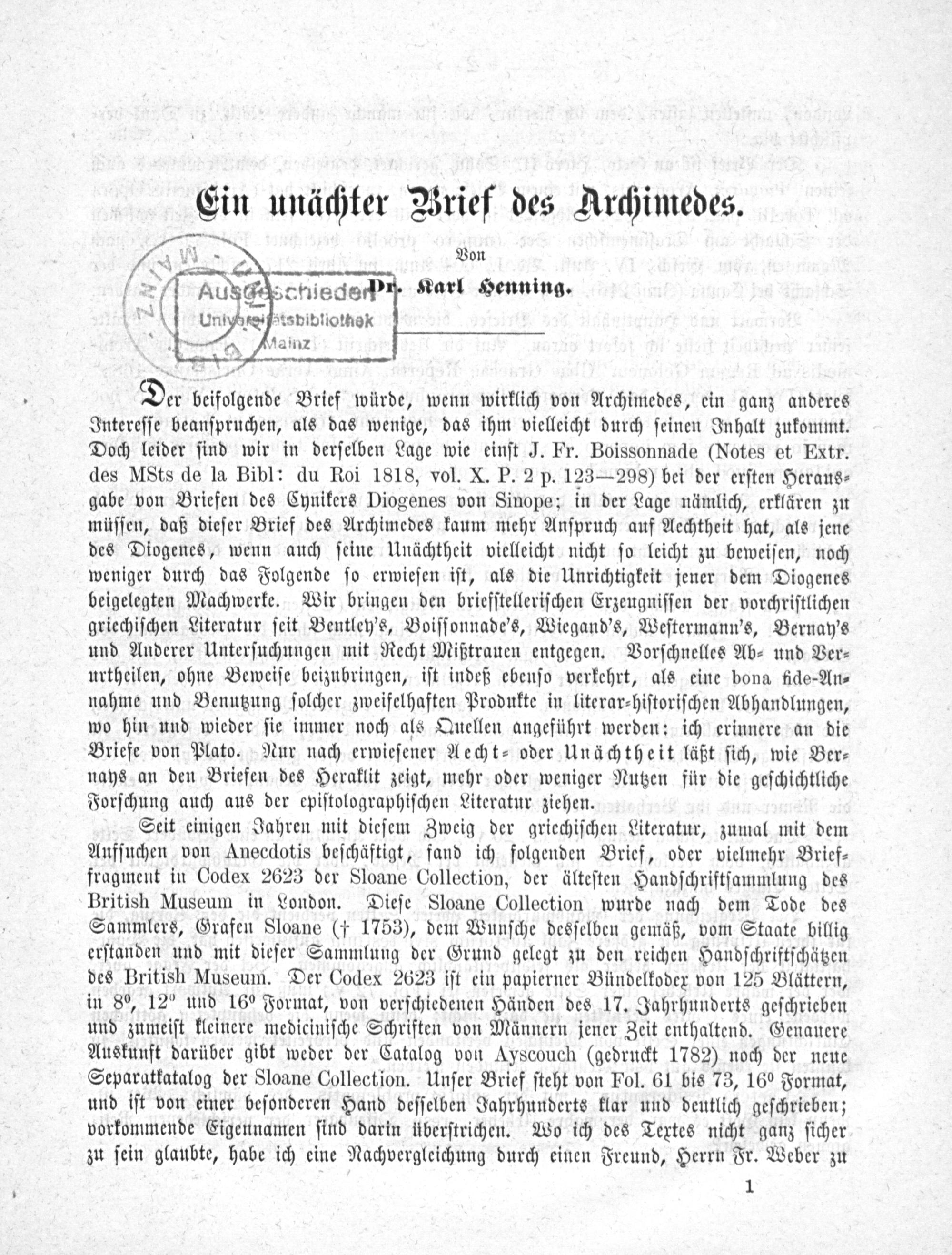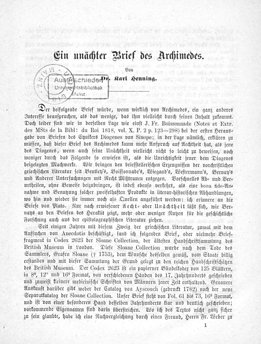 Ein unächter Brief des Archimedes