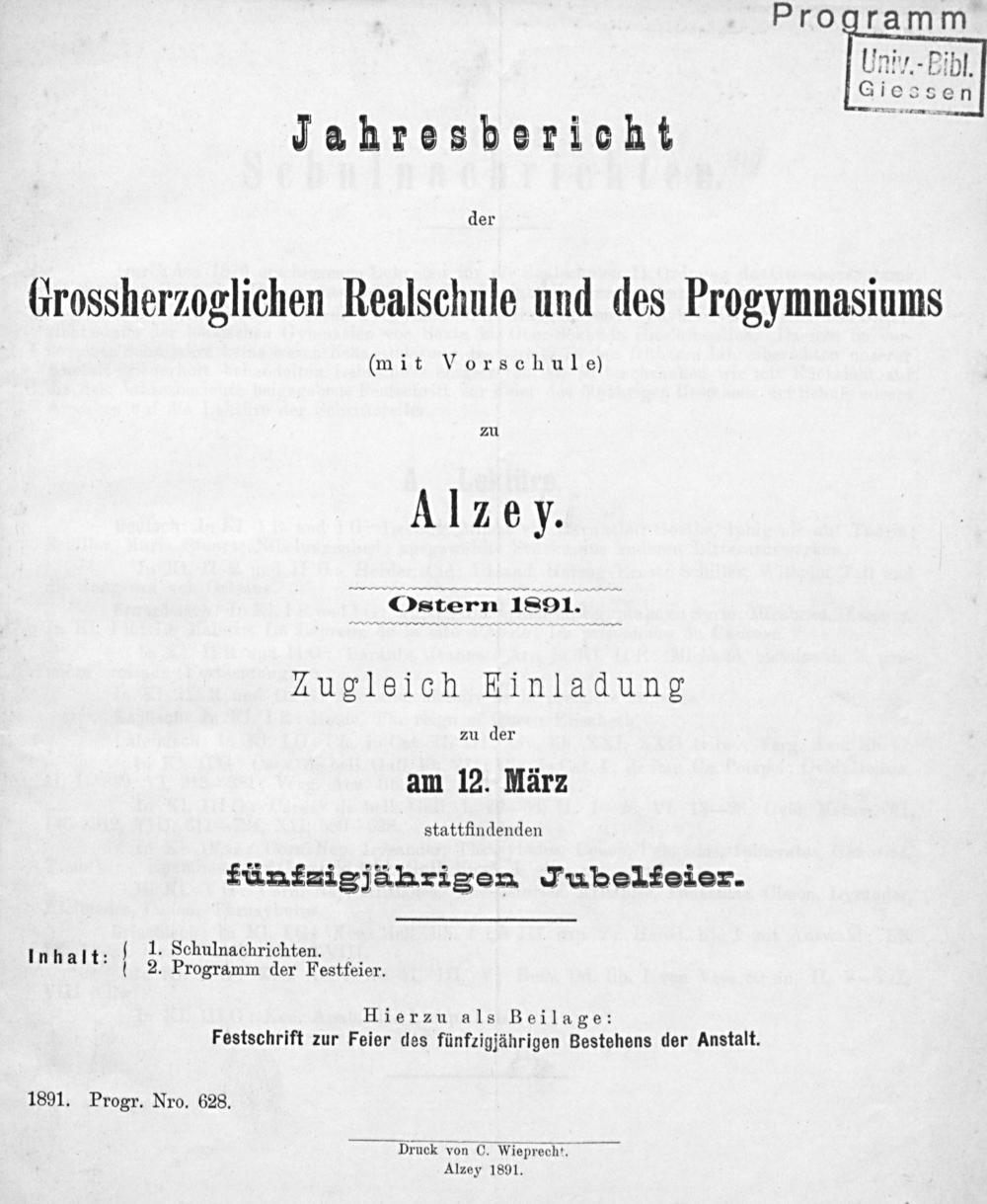 Bericht über die 50jährige Jubelfeier der Großh. Realschule und des Progymnasiums zu Alzey