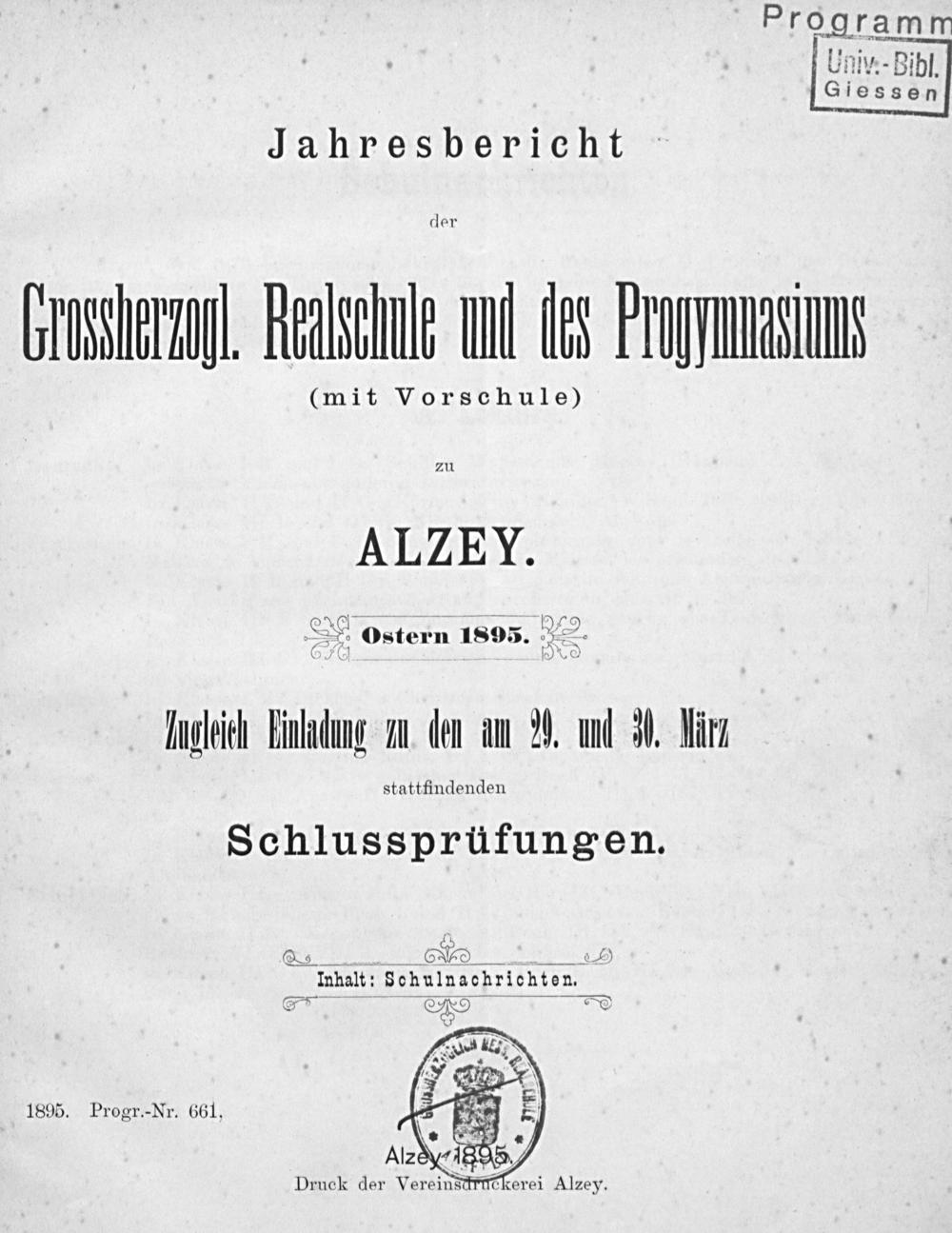 Jahresbericht der Grossh. Realschule und des Progymnasiums (mit Vorschule) zu Alzey