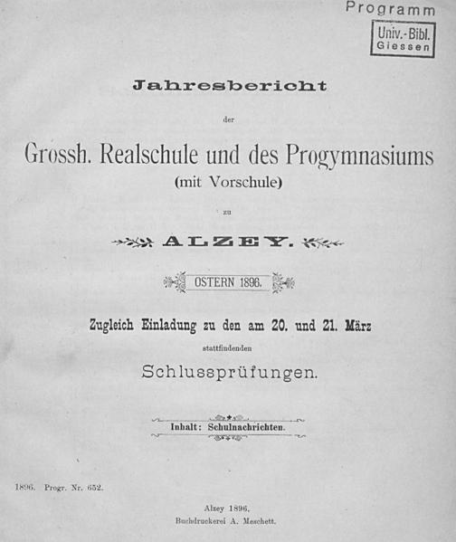Jahresbericht der Grossh. Realschule und des Progymnasiums (mit Vorschule) zu Alzey