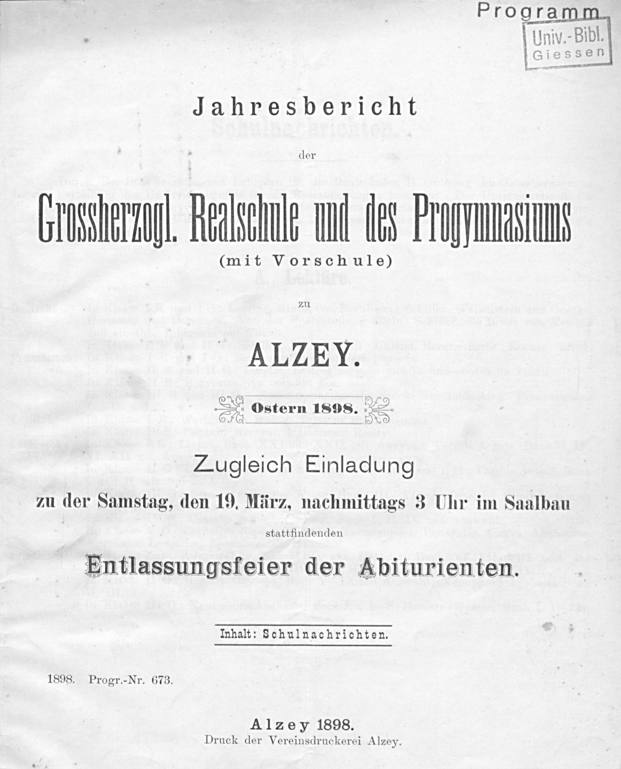 Jahresbericht der Grossh. Realschule und des Progymnasiums (mit Vorschule) zu Alzey